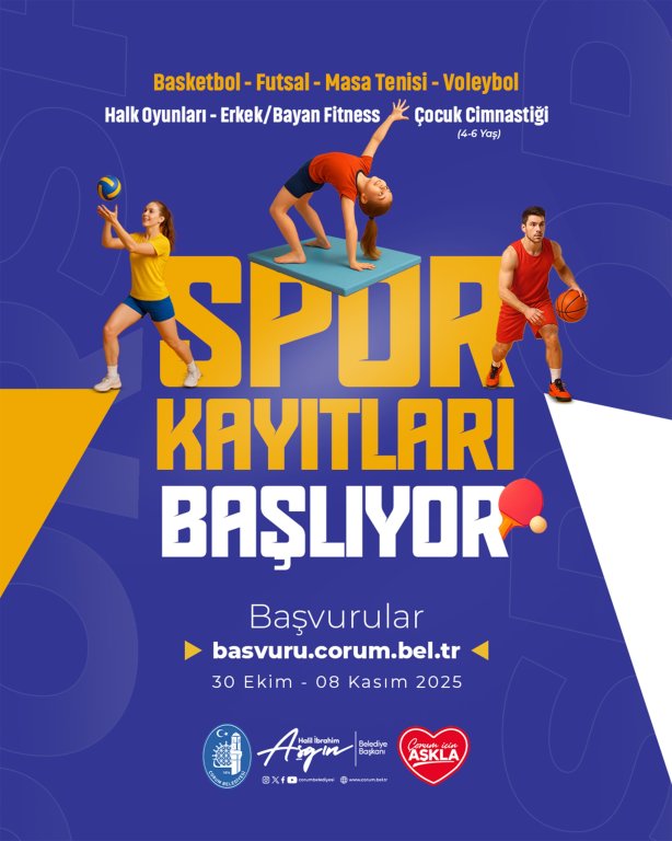 Çorum Belediyesi Gençlik ve Spor Hizmetleri Müdürlüğü bünyesinde faaliyet gösteren spor tesislerimizin kayıtları 30 Ekim Saat 08:30 – 08 Kasım 2025 tarihleri arasında Çorum Belediyesi Online Kayıt Sistemi üzerinden alınacaktır.