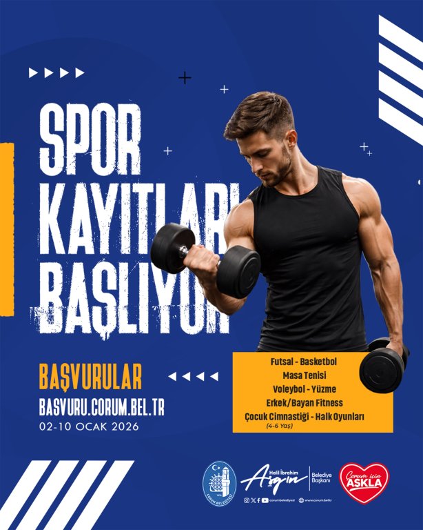 Çorum Belediyesi Gençlik ve Spor Hizmetleri Müdürlüğü bünyesinde faaliyet gösteren spor tesislerimizin 2026 sezonu kayıtları02 Ocak 2026 Cuma günü saat 08.30’da başlayacak olup 10 Ocak 2026 tarihine kadar Çorum Belediyesi Online Kayıt Sistemi üzerinden alınacaktır.