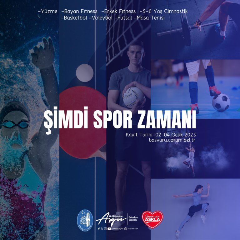 Çorum Belediyesi Gençlik ve Spor Hizmetleri Müdürlüğü bünyesinde faaliyetlerini sürdüren Spor Tesislerimiz 2025 Yılı İlk kayıtlarını 02 - 04 Ocak 2025 tarihleri arasında  https://basvuru.corum.bel.tr/ adresinden Online olarak alınacaktır. Kontenjanlarımız sınırlı sayıdadır.
