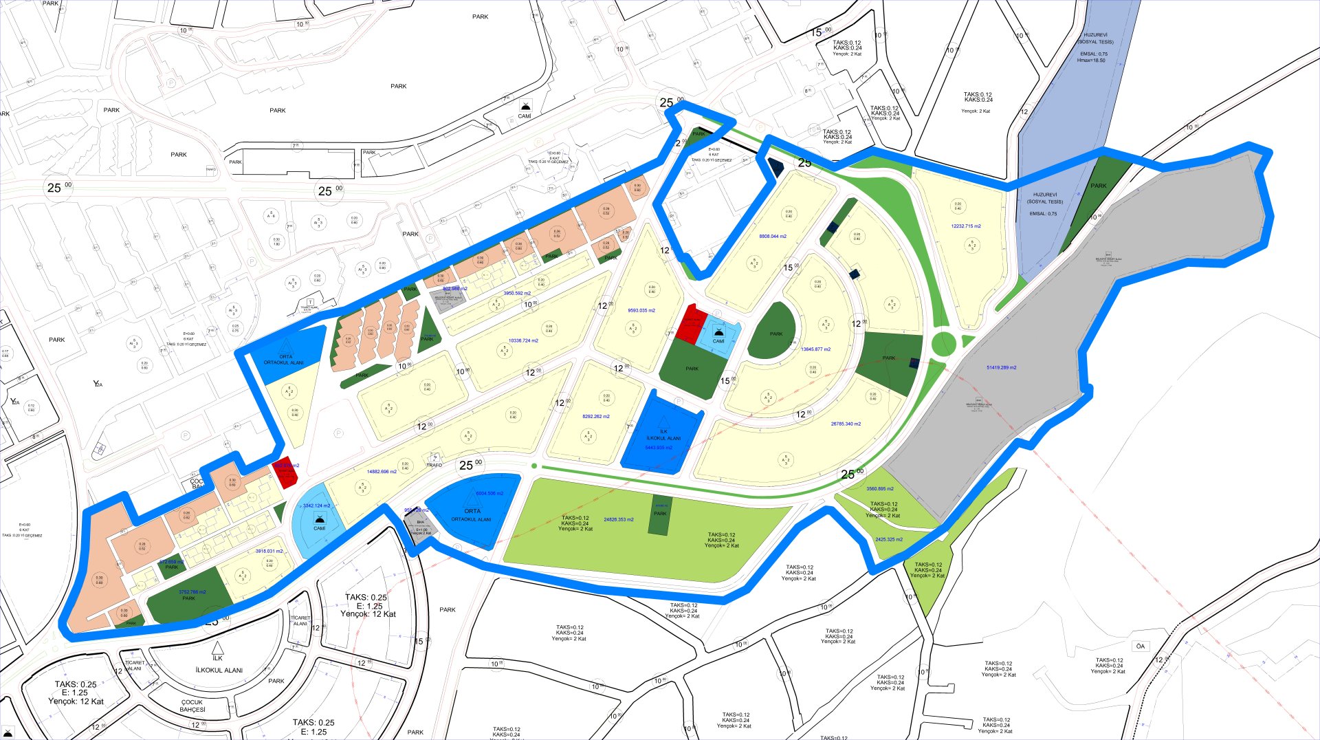 TAKS:0.12, KAKS:0.24, Yençok:2 kat yapılaşma koşullarına sahip konut alanlarında 01.09.2016 tarih 128 sayılı Belediye Meclis Kararı ile onaylanan plan hükümleri geçerlidir. Şeklinde plan hükmü eklendiği görülmektedir. Şeklindeki yaklaşık 38 hektarlık alana yönelik olarak A grubu plan müellifi tarafından hazırlanan 1/5000 ölçekli Nazım İmar Planı (NİP:191011530) ve 1/1000 ölçekli Uygulama İmar Planı (UİP:191011532) Revizyonu teklifi, 3194 sayılı imar kanununun 8/b maddesi gereğince, Meclisçe 07.04.2023 tarih ve 69 sayılı karar ile OY ÇOKLUĞUYLA onanmıştır.