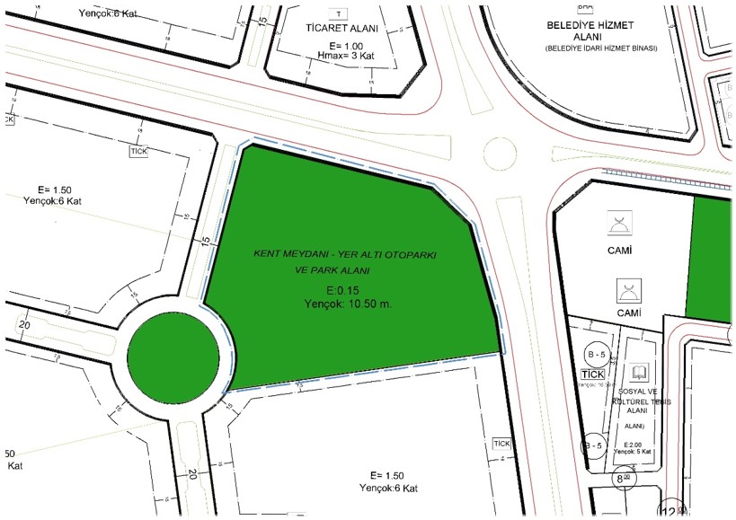 Çepni Mahallesi, 4333 adanın kuzeyinde yer alan yaklaşık 2 hektarlık alan, imar planında Emsal: 0,15 Yençok: 10,50 metre yapılaşma koşullarında “Kent Meydanı, Yer altı otoparkı ve Park” olarak planlandığı,