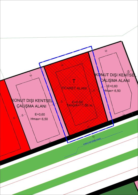 1/1000 ölçekli Uygulamalı İmar Planı teklifinde; kullanım kararı “Ticaret Alanı” Yapılaşma koşulları ise E:0.60, Yençok: 11.50 metre olarak yeniden belirlenmiştir;