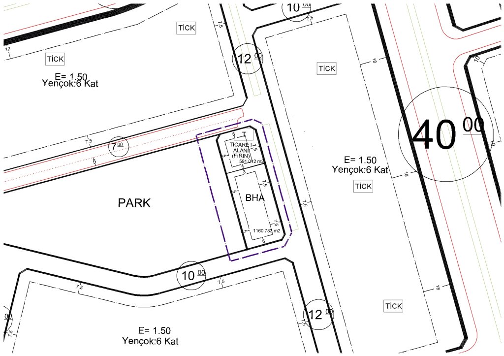 Yençok:2 kat yapılaşma koşullarına sahip Ticaret Alanı(fırın) işaretlendiği,