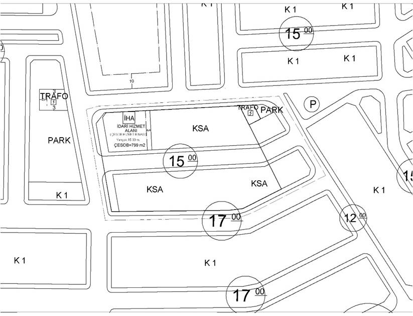 - Parselin kuzey-batı köşesinde yaklaşık 800 m²lik İdari Hizmet Alanı (ÇESOB Hizmet Binası) işaretlendiği ve plan notlarına;