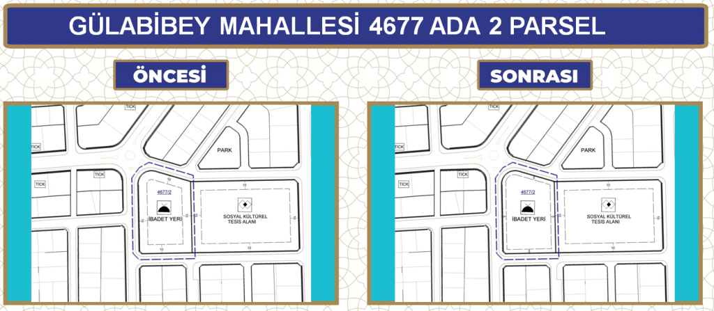 Gülabibey Mahallesi, 4677 ada, 2 nolu parsele yönelik olarak 4677 ada 2 nolu parselin plan fonksiyonunun değiştirilmediği, tüm cephelerinde 10 metre olarak işaretli bulunan yapı yaklaşma mesafesinin 5 metre olarak değiştirildiği ve plan notlarına “Cami Alanında Emsal ve Yençok ilgili kurum tarafından ihtiyaca göre belirlenecektir.” Şeklindeki 1/1000 ölçekli Uygulama İmar Planı (UİP:191018306) değişikliği teklifi, 3194 Sayılı İmar Kanununun 8/b maddesi gereğince, Meclisçe 08.06.2023 tarih ve 101 sayılı karar ile OY BİRLİĞİYLE onanmıştır.