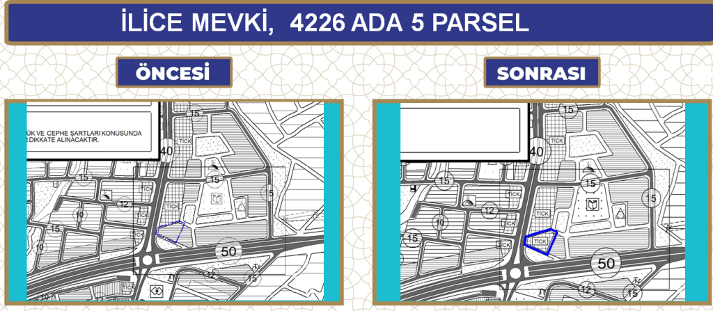 İlice Mevki, 4226 ada 5 parselin Çorum idare Mahkemesinin 2022/898 Esas nolu, 2023/256 Karar nolu mahkeme kararında belirtilen hususlar dikkate alınarak zemin katta ticari kullanıma olanak sağlayacak şekilde Belediyemizce plan müellifine hazırlattırılan 1/5000 ölçekli Nazım İmar Planı Değişikliği teklifi ile “Ticaret+Konut” alanı olarak planlanması şeklindeki A grubu plan müellifine hazırlattırılan 1/5000 ölçekli Nazım İmar Planı(NİP:191018347) değişikliği teklifi, 3194 Sayılı İmar Kanunun 8/b maddesi gereğince, Meclisçe 08.06.2023 tarih ve 95 sayılı karar ile OY BİRLİĞİYLE onanmıştır.