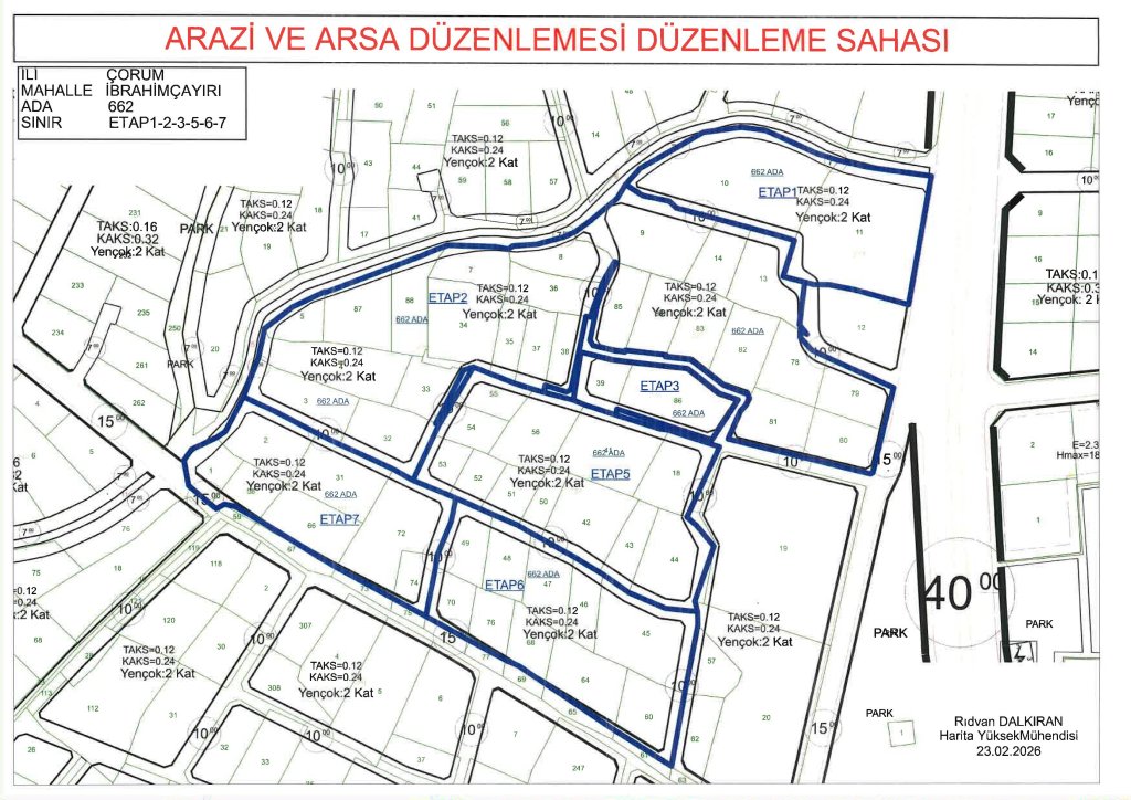 İlimiz Merkez İbrahimçayırı Mahallesi 662  Ada da  arazi ve arsa düzenleme işi tamamlanmıştır.  3194 Sayılı İmar Kanunu’nun 18. Maddesine istinaden yaptırılacak olan arazi ve arsa düzenlemesine göre Encümenimizin  19.02.2026   tarih ve 459, 460, 461, 462, 463, 464  sayılı kararları  ile parselasyonu yaptırılmış olup, parselasyon haritası ve eki evraklar İmar ve Şehircilik Müdürlüğümüz ilan panosunda  bir ay süre ile  askı ilanına çıkartılmıştır.