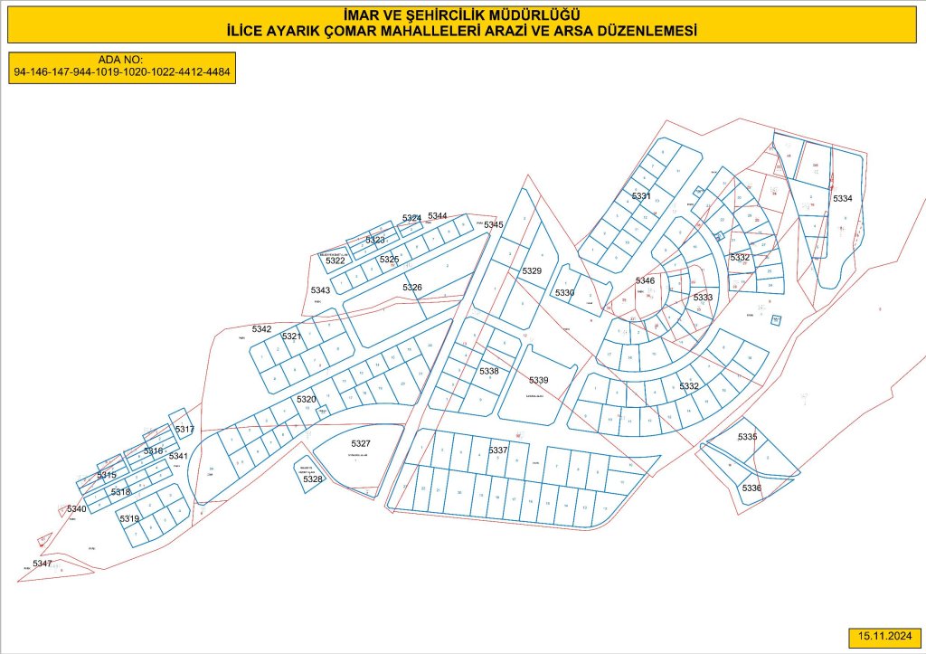 İlimiz Merkez İlice, Ayarık, Çomar Mahallelerinde  94, 146, 147, 944, 1019, 1020, 1022, 4412, 4484 Adalarda arazi ve arsa düzenleme işi tamamlanmıştır. 3194 Sayılı İmar Kanunu’nun 18. Maddesine istinaden yaptırılacak olan arazi ve arsa düzenlemesine göre Encümenimizin 14.11.2024  tarih ve 1929  sayılı kararı ile parselasyonu yaptırılmış olup, parselasyon haritası ve eki evraklar İmar ve Şehircilik Müdürlüğümüz ilan panosunda bir ay süre ile  askı ilanına çıkartılmıştır.