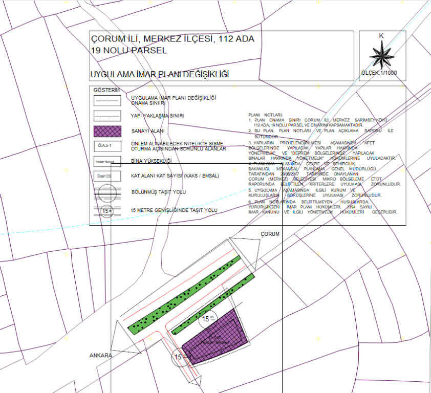 ·             1/1000 ölçekli Uygulama İmar Planı teklifinde; parselin tüm yapılanma koşulları korunmuştur. Ankara Samsun karayoluna paralel 15 metre genişlikteki Taşıt yolu, yaya yolu olarak planlanmıştır.