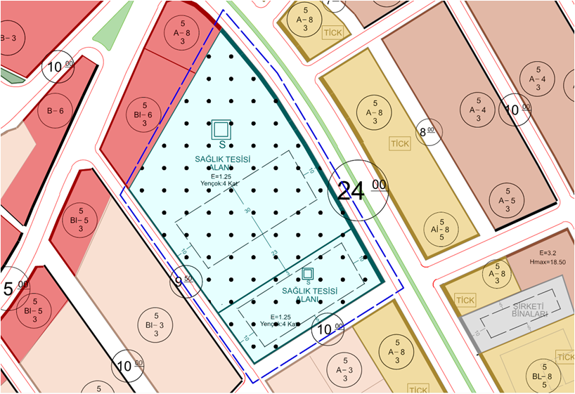 yapılaşma koşulları E:1,25 Yençok: 4 Kat olmak üzere “Sağlık Tesis Alanı”