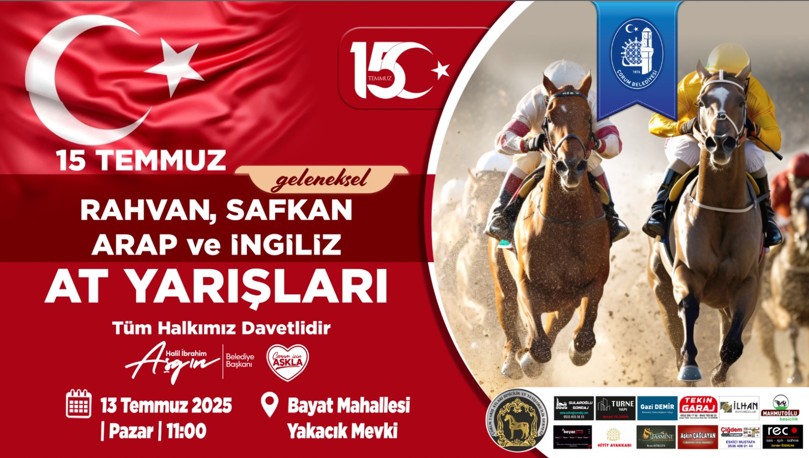 Çorum Belediyesi tarafından geleneksel olarak düzenlenen At Yarışları bu senede merkeze bağlı Bayat Mahallesi Yakacık Mevkii'nde 13 Temmuz 2025 Pazar günü saat 11:00 de siz değerli At Yarışı seven halkımızın karşısında kıyasıya mücadele edeceklerdir.
