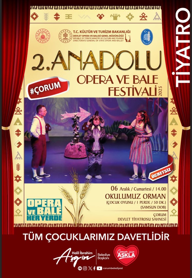 Kültür ve Turizm Bakanlığı Devlet Opera ve Balesi (DOB) Genel Müdürlüğü tarafından organize edilen "2. Anadolu Opera ve Bale Festivali" kapsamında “Okulumuz Orman” adlı çocuk oyununa tüm Çorum halkı davetlidir.