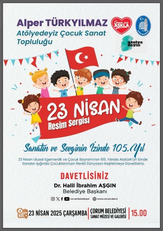 Alper TÜRKYILMAZ Öncülüğünde 23 Nisan Ulusal Egemenlik ve Çocuk Bayramı'nın 105. Yılında Atatürk'ün İzinde Sanatın Işığında Çocuklarımızın Renkli Dünyasını Keşfetmeye Davetlisiniz.