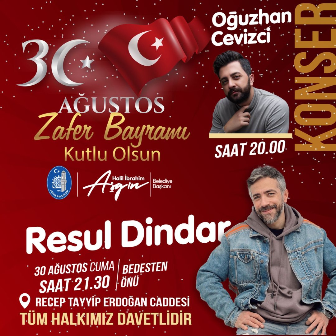 Belediyemizin 30 Ağustos Zafer Bayramı kapsamında gerçekleştireceği, ünlü sanatçı Resul Dindar ve hemşehrimiz Oğuzhan Cevizci konserlerine tüm halkımız davetlidir.