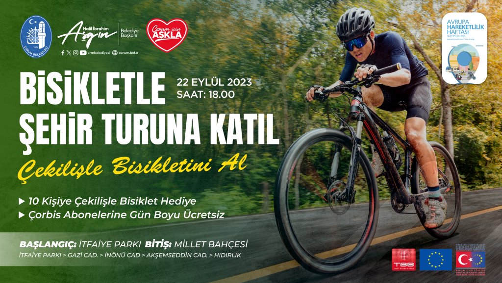 Avrupa Hareketlilik Haftası kapsamında Bisikletle Şehir Turuna katılan 10 şanslı isme çekiliş ile bisiklet verilecek. Etkinliğimize tüm halkımız davetlidir.