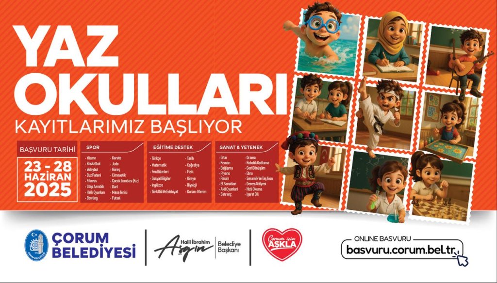 Belediyemiz tarafından düzenlenen yaz okullarında; Spor, eğitime destek, sanat ve yetenek kategorilerinde toplam 44 branş içeriyor. 23-28 Haziran tarihleri arasında yapılacak başvurular, "basvuru.corum.bel.tr" adresi üzerinden online olarak alınacak. Yaz okullarında çocuklar hem öğrenecek hem de doyasıya eğlenecek.