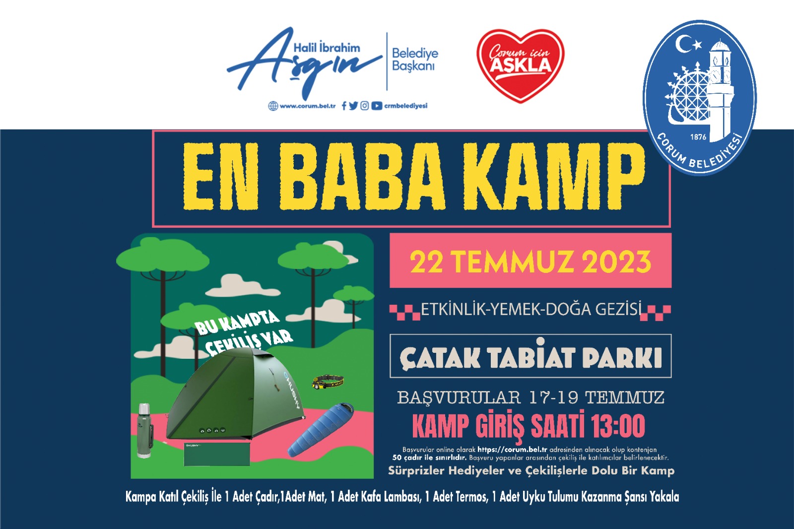 • Belediyemizin her sene düzenlemiş olduğu En Baba Kamp etkinliği bu sene de 22 - 23.07.2023 tarihleri arasında Çatak Tabiat Parkında gerçekleşecektir.