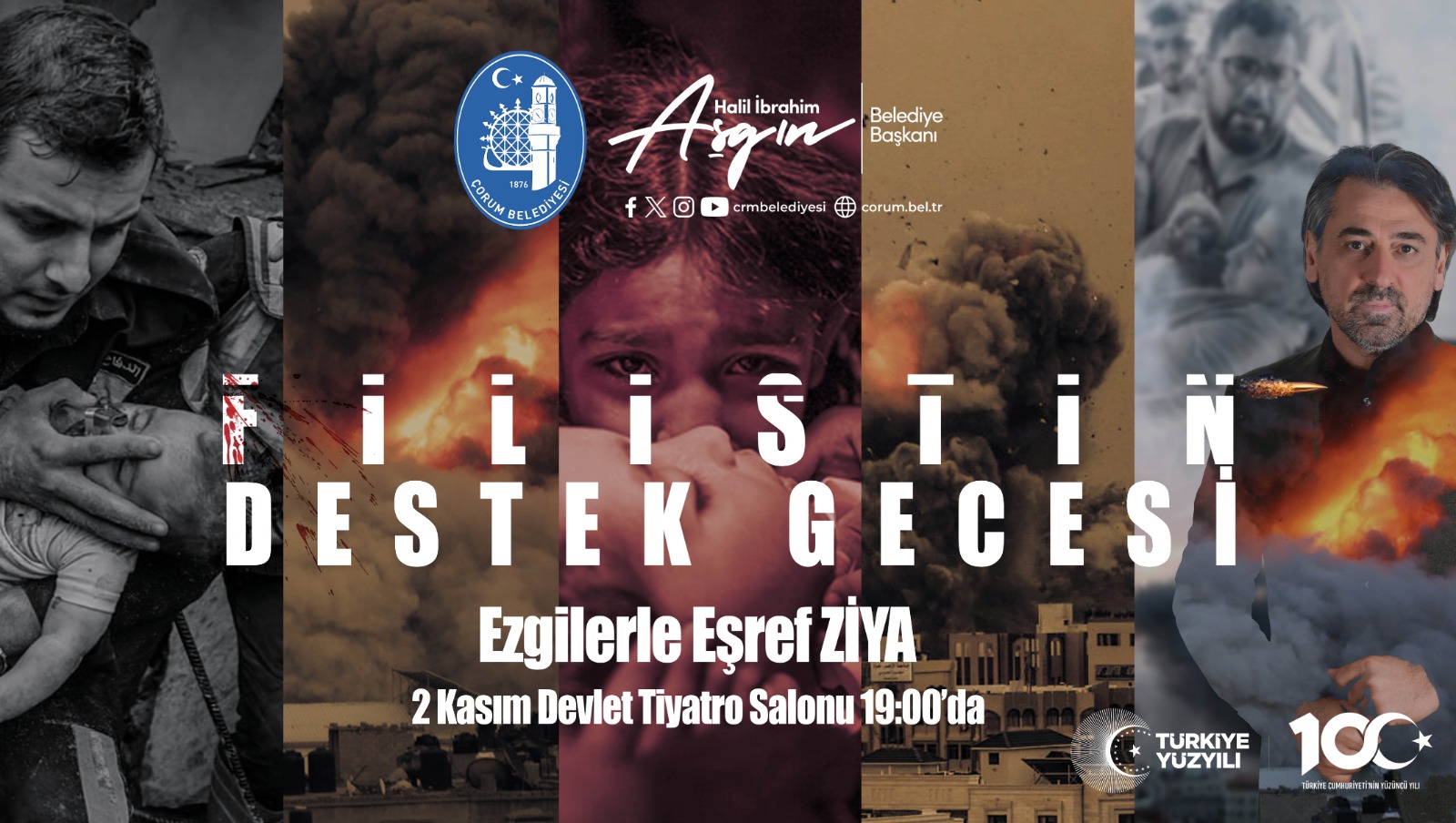 Çorum Belediyesi'nin düzenlemiş olduğu,  Sanatçı  Eşref  Ziya'nın  ezgileri ile    eşlik edeceği  ''Filistin'e Destek  Gecesi'' ne  tüm  halkımız davetlidir.