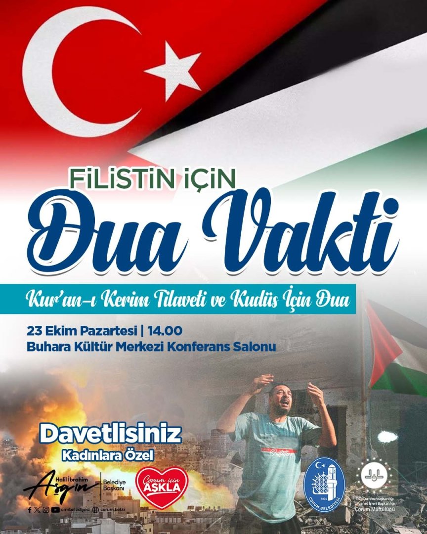 Belediyemiz' in  düzenlediği  Kadınlara  özel  ''Filistin  için Dua Vakti ''  Programımıza  Tüm  halkımız  davetlidir.