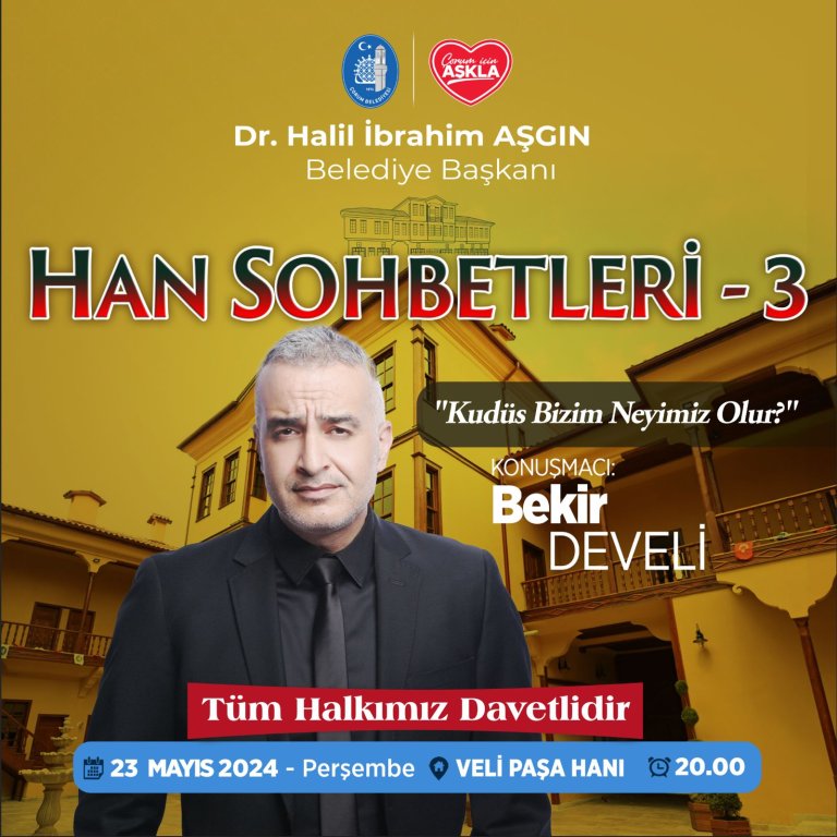 Belediyemizin kültür-sanat etkinlikleri kapsamında düzenlediği, konuşmacı olarak ünlü programcı ve sunucu Bekir Develi'nin katılacağı "Kudüs Bizim Neyimiz Olur" konulu 'Han Sohbetleri' programımıza tüm halkımız davetlidir.