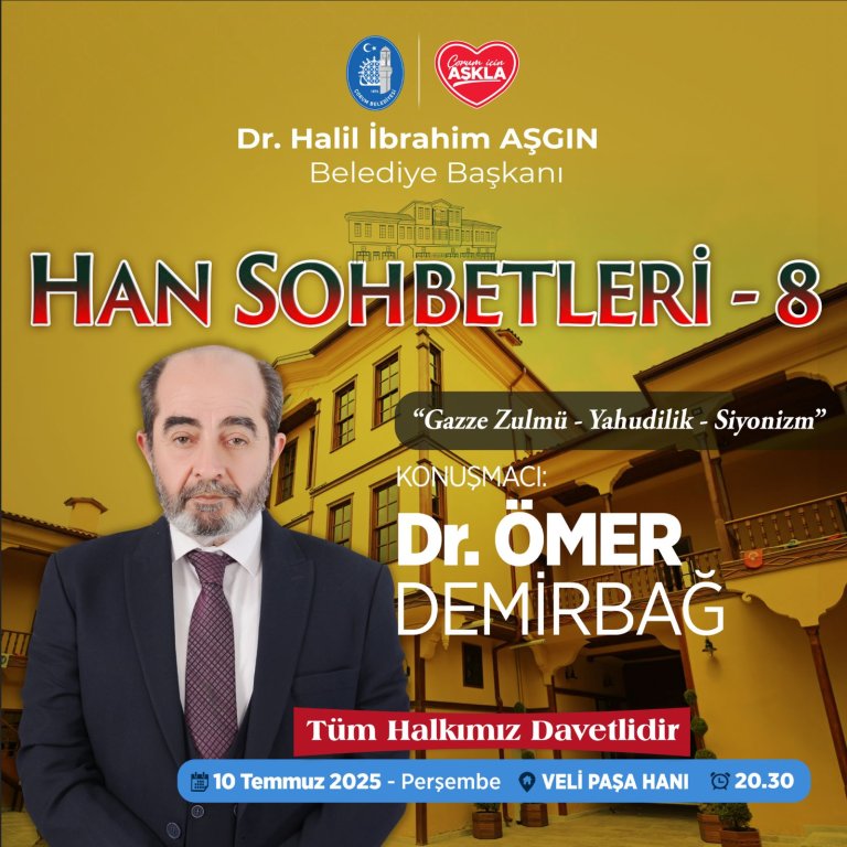 Belediyemiz tarafından Velipaşa Hanı'nda düzenlenen sohbetlerin bu ayki konuğu yazar-akademisyen Dr. Ömer Demirbağ olacak. Gazze Zulmü, Yahudilik, Siyonizm konulu Han Sohbetlerine tüm halkımız davetlidir.