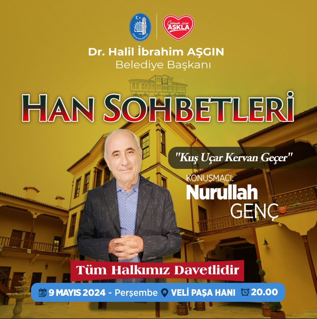 Belediyemizin kültür-sanat etkinlikleri kapsamında düzenlediği, konuşmacı olarak ünlü şair ve yazar Nurullah Genç'in katılacağı "Kuş Uçar Kervan Geçer" konulu 'Han Sohbetleri' programımıza tüm halkımız davetlidir.