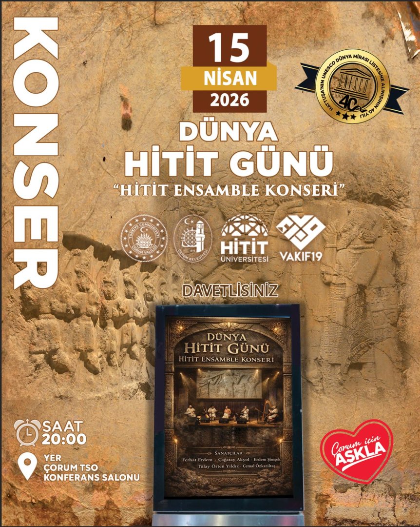 Hattuşa'nın UNESCO Dünya Mirası Listesine Alınışının 40. Yılı Etkinlikleri kapsamında düzenlenecek "Hitit Ensamble Konseri"ne tüm halkımız davetlidir.