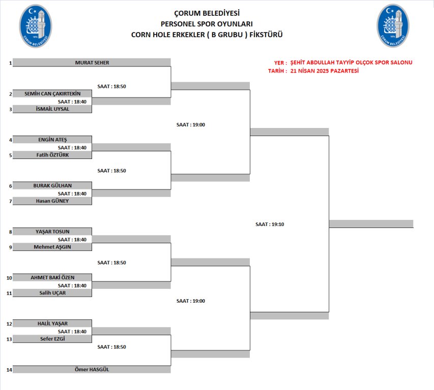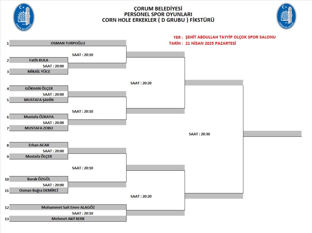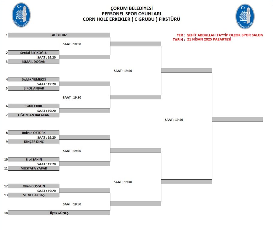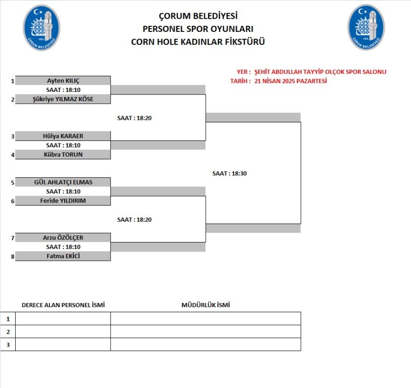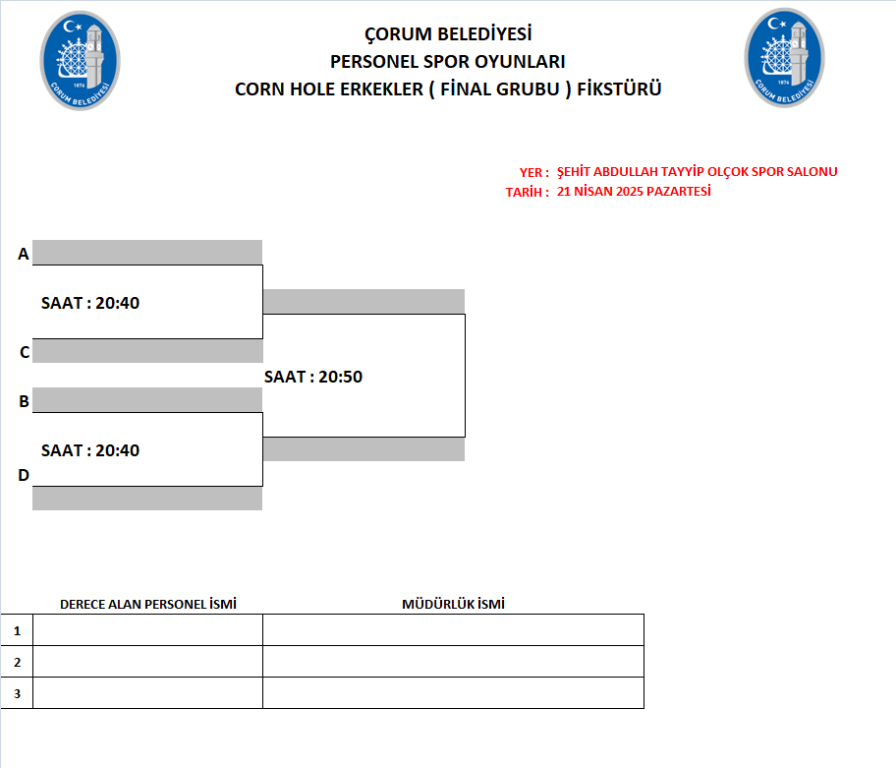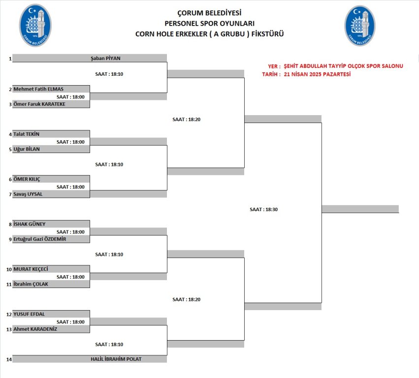 CORN HOLE  : 21 Nisan 2025 tarihinde saat 18:00 Şehit Abdullah Tayyip OLÇOK Spor Salonunda