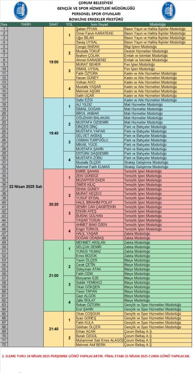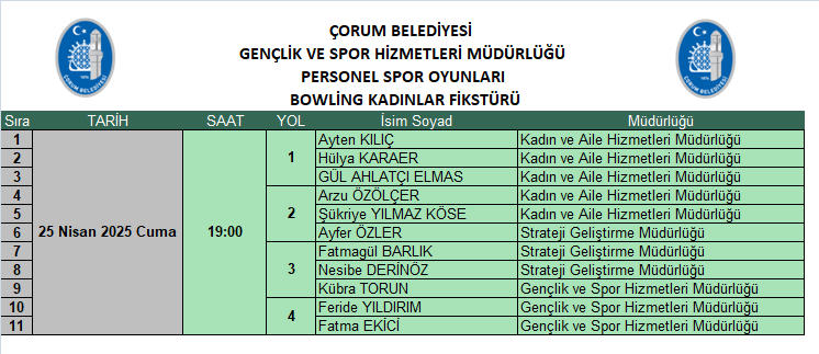 BOWLİNG      :  22 - 24 - 25 Nisan 2025 tarihlerinde saat 19:00 da Buhara Kültür Merkezi Bowling Salonunda