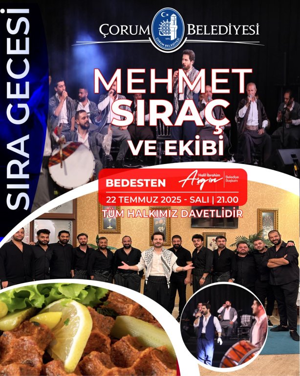 Kültür sanat etkinliklerimiz kapsamında Mehmet Sıraç ve Ekibi, sıra gecesi ile hemşehrilerimizle buluşacak. Çiğ köfte ikramımızın da yer alacağı konserimize tüm hemşehrilerimiz davetlidir.
