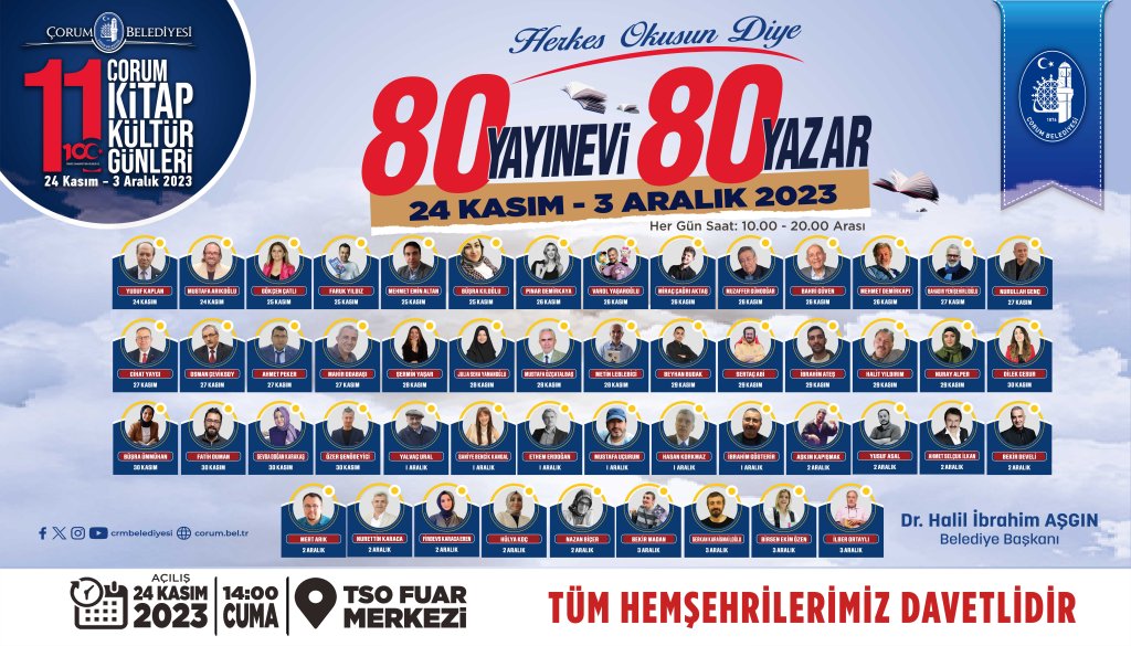 11. Çorum Kitap Kültür Günleri 24 Kasım - 3 Aralık tarihlerinde her gün ünlü bir yazarı okur severleriyle buluşturacak. Herkes Okusun diye 80 Yayınevi 80  Yazarın katılımıyla gerçekleştirilecek Kitap Kültür günlerine senide bekliyoruz...