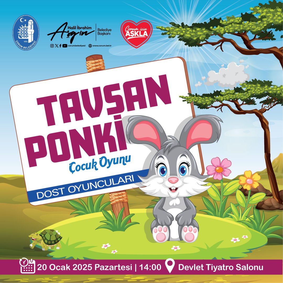 Belediyemizin kültür-sanat etkinlikleri kapsamında düzenlediği "Tavşan Ponki" adlı çocuk oyununa tüm çocuklarımız davetlidir.