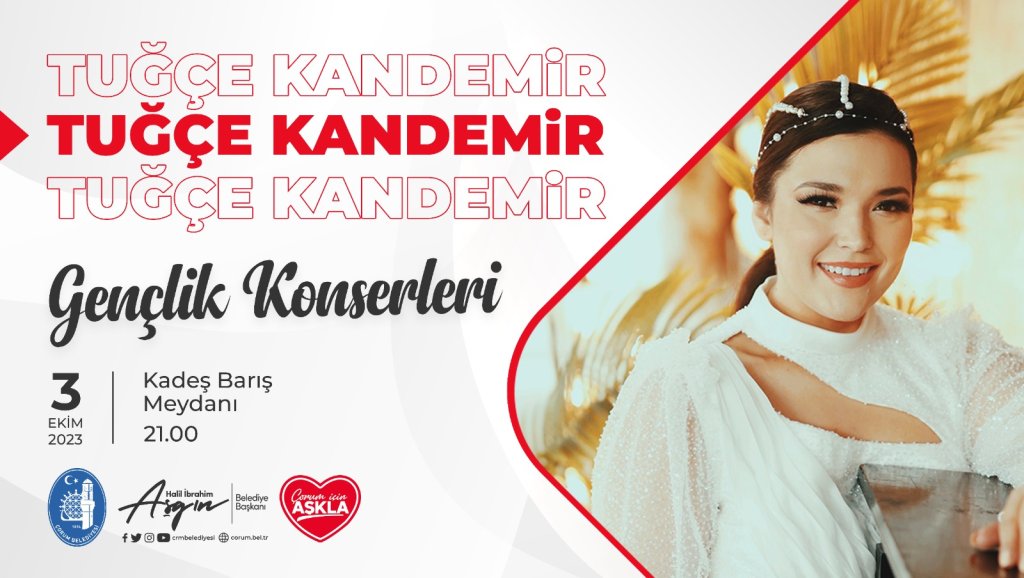 Çorum Belediyesi olarak   ünlü sanatçıları halkımızla buluşturmaya devam ediyoruz. Gençlik Konserleri kapsamında bu kez son yılların popüler sanatçısı  Tuğçe KANDEMİR sahne alıyor. Bu muhteşem konserimize tüm halkımız davetlidir.