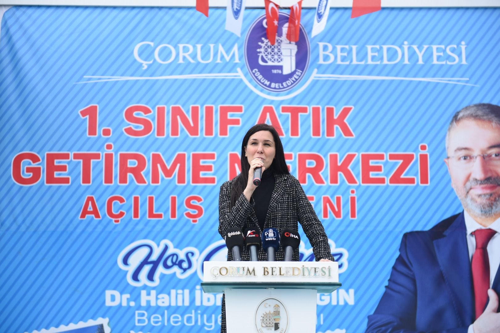 1.Sınıf Atık Getirme Merkezi açılışında konuşan AK Parti Genel Başkan Yardımcısı Çiğdem Karaaslan çevre ve doğayla ilgili yaptığı yatırım ve projelerden dolayı Belediye Başkanı Dr. Halil İbrahim Aşgın’ı tebrik ederek; “Çorum’da göz doldurucu çalışmalara imza atılmakta. Hem yeşil alan varlığını artıran, hem toplumda ciddi bir bilinç oluşturma gayesi olan, yenilenebilir enerji yatırımları yapan, sıfır atık projesi kapsamında ciddi hamleler yapan konuya ciddi hakim olan bir belediyemiz var. Kendilerini tebrik ediyorum.” dedi