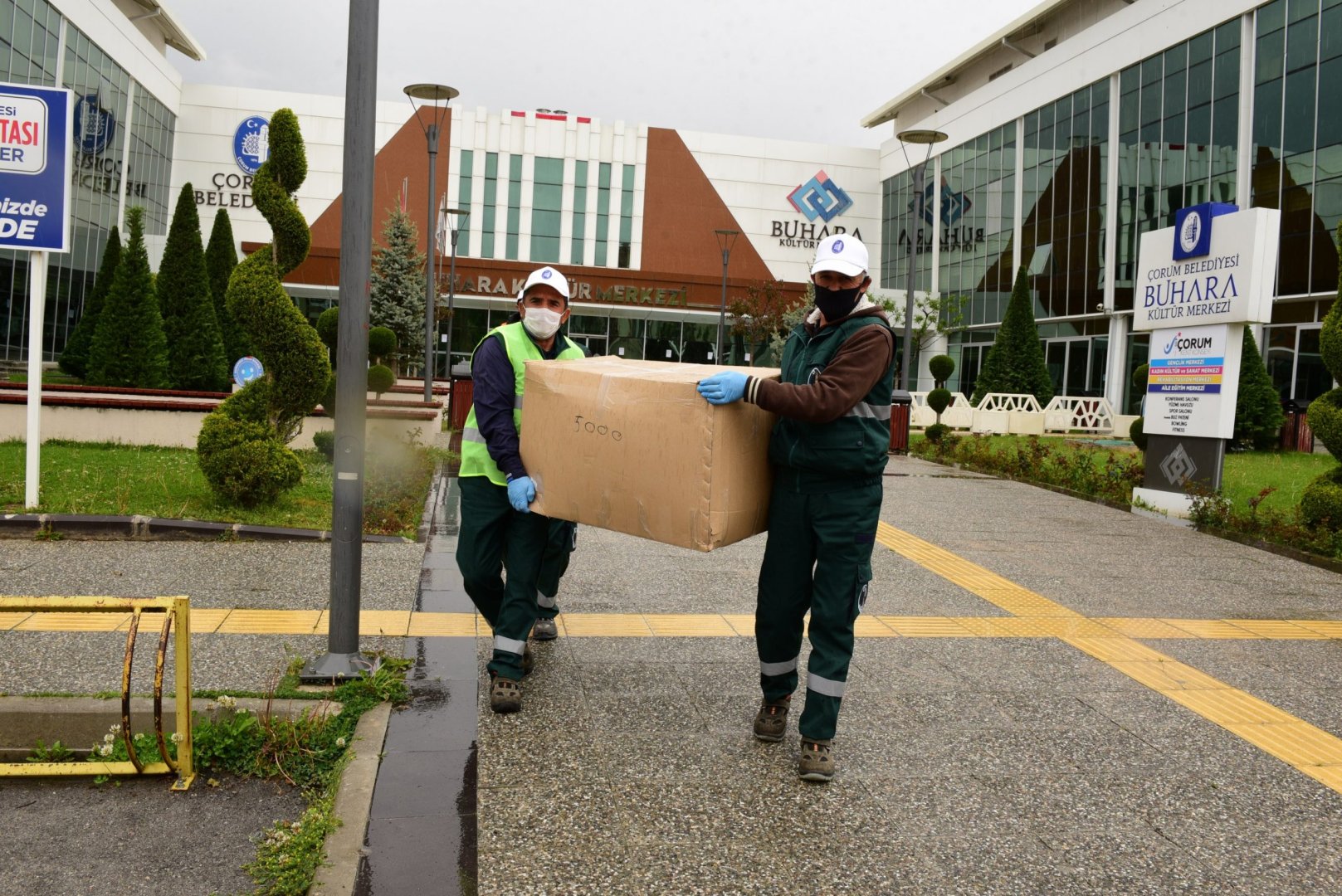 Buhara Kültür Merkezinde maske dağıtımı yapacak personelle bir araya gelen Belediye Başkanımız Dr. Halil İbrahim Aşgın, maskelerin paketlenmesinden dağıtım sürecine kadar yoğun bir mesai içerisinde çalışan tüm personele teşekkür etti. “Nano teknolojiyle pamuklu kumaştan üretilmiş 200 bin maskeyi bugünden itibaren hemşehrilerimize ulaştırmaya başladık.” diyen Başkan Aşgın, Çorum’da yaşayan 20 yaş üzeri herkese bu maskelerden dağıtacaklarının altını çizdi.