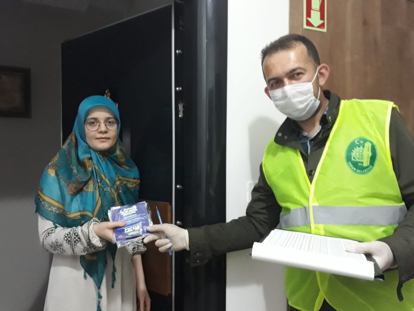 230 personelin dağıtımını yaptığı nano teknolojiyle pamuklu kumaştan üretilen maskelerin dağıtımı esnasında evde bulanmayan vatandaşlar maskelerini daha sonra Çorum Belediyesi Zabıta Müdürlüğünden alabilecek. Maske dağıtımı esnasında evinde bulunmayan vatandaşlar için maskelerini Zabıta Müdürlüğünden alacaklarına dair bilgi notu kapıya yapıştırılıyor. Vatandaşlar daha sonra bu etiketle Zabıta Müdürlüğünden maskelerini alabilecekler.
