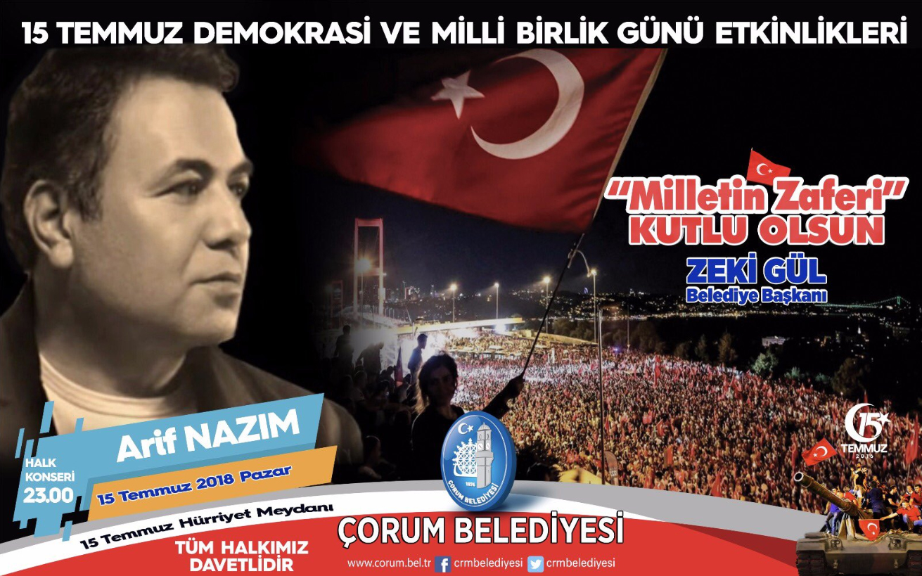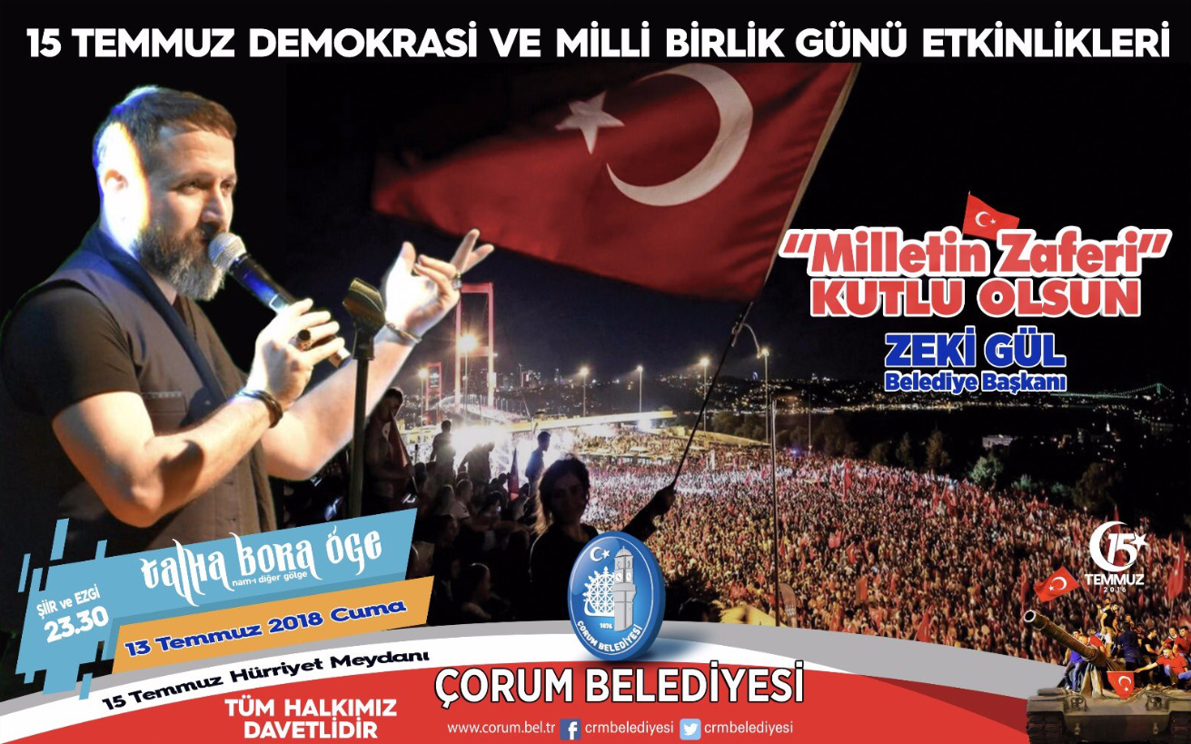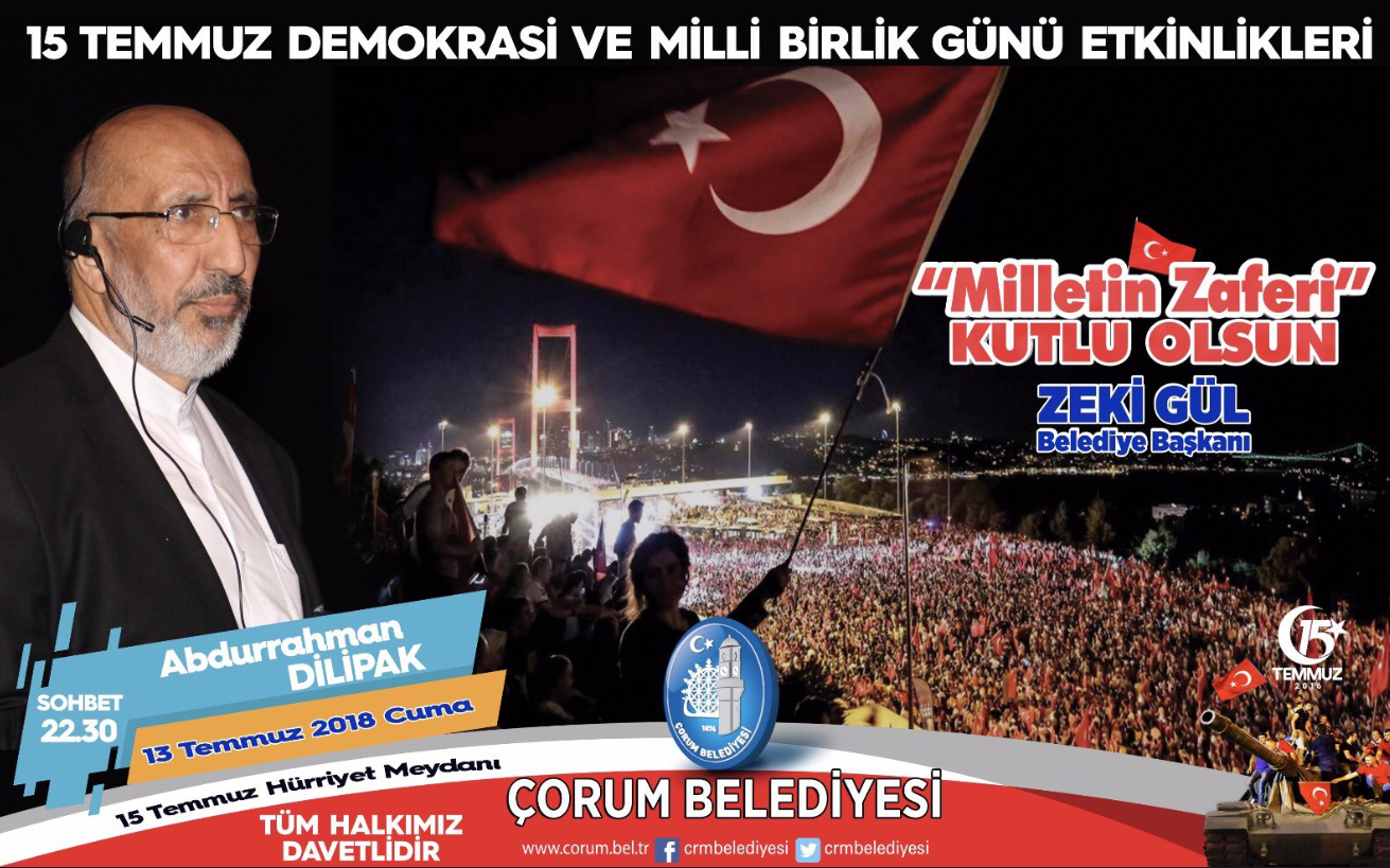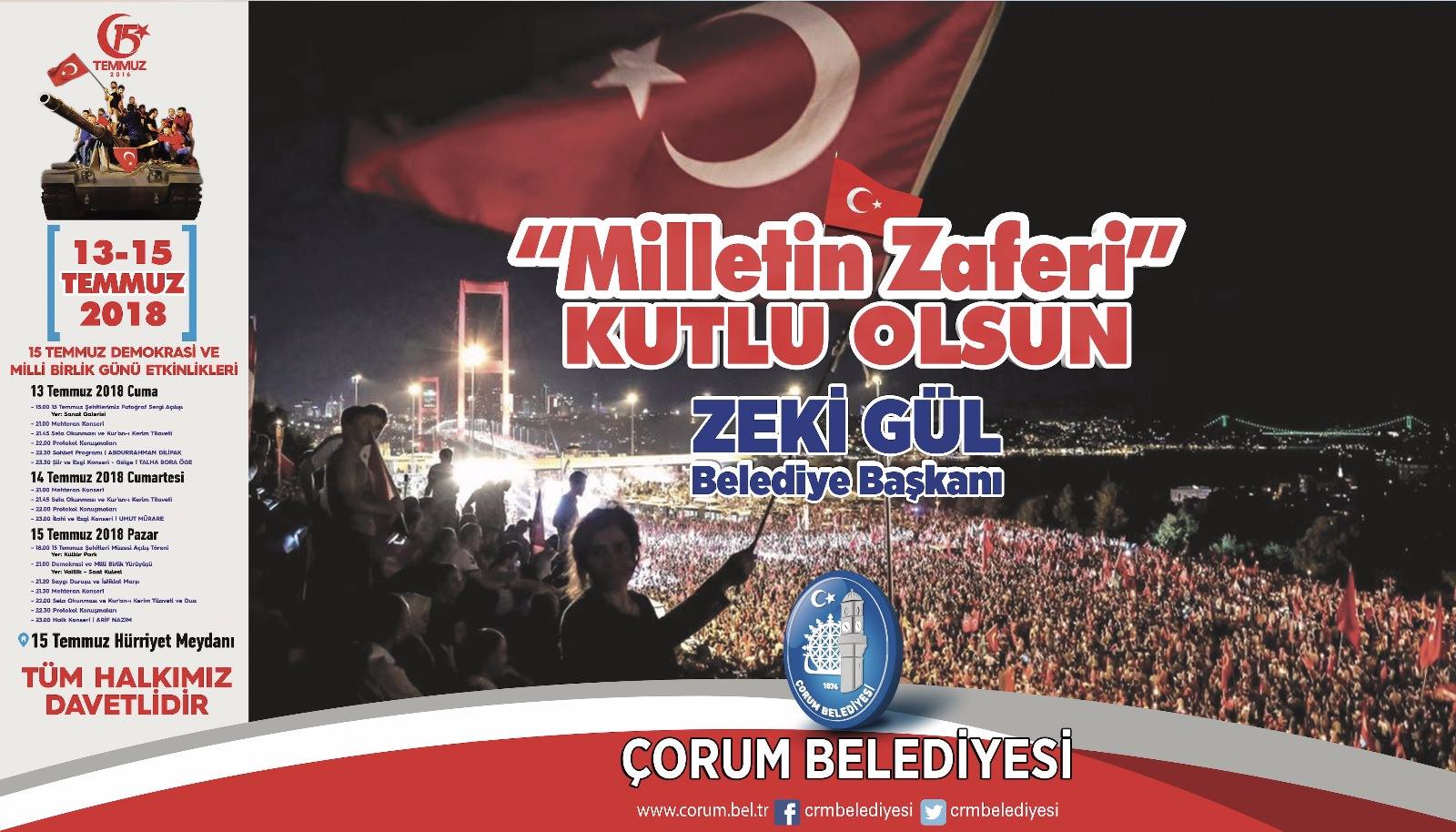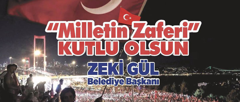 Cumhurbaşkanımız Sayın Recep Tayyip Erdoğan’ın çağrısı ile milletimiz, tarihte eşine çok az rastlanan birliktelikle kenetlenerek 16 Temmuz sabahında işgal, iç savaş ve darbe girişimine karşı milli zafer ilan etti diyen Belediye Başkanı Zeki Gül, 15 Temmuz, büyük bir millet olma bilincimizi, kararlılığımızı, canımız pahasına ortaya koyduğumuz bir milat olarak tüm mazlum milletlere örnek oldu dedi.