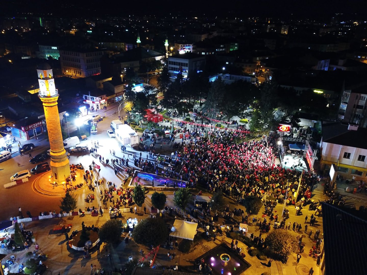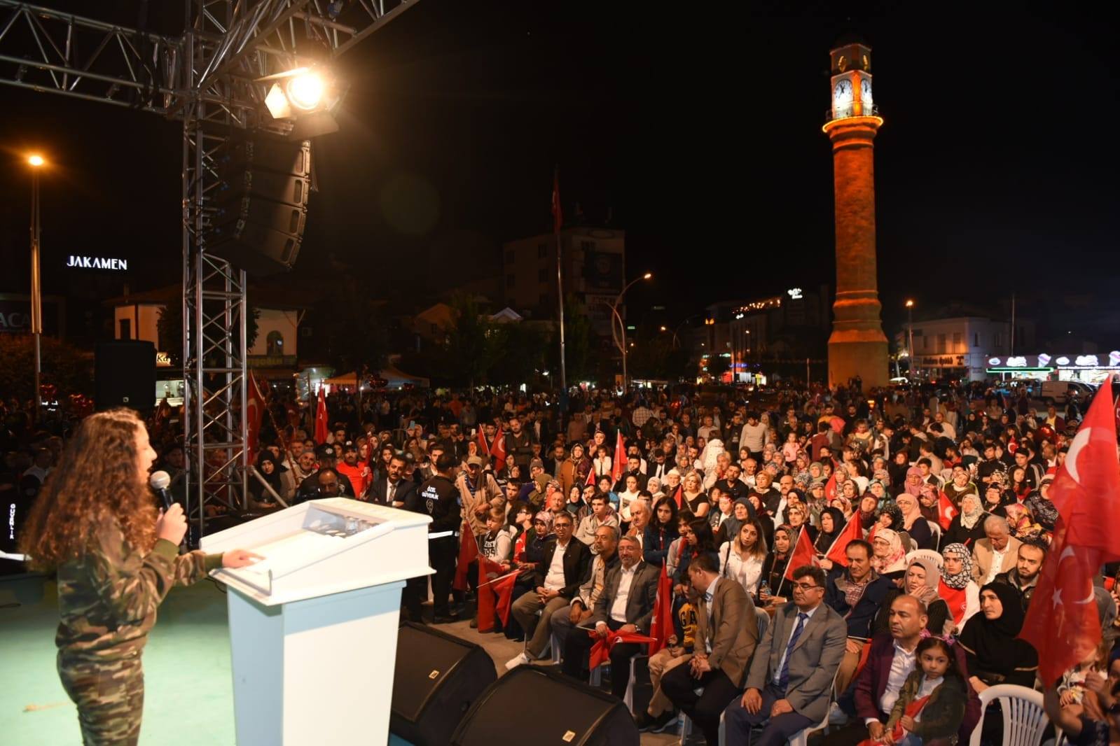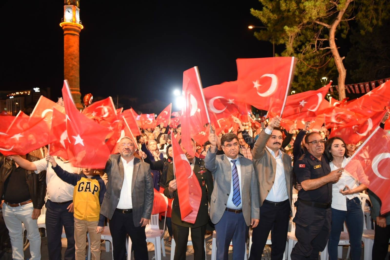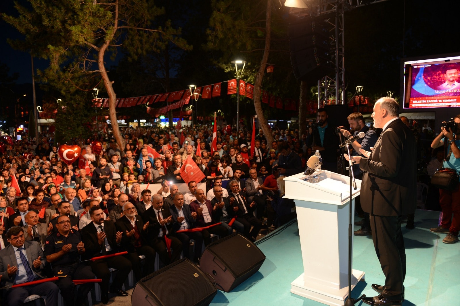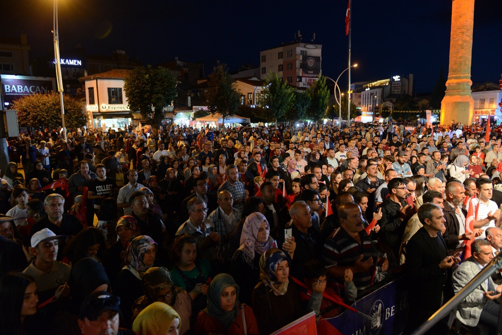 Belediye Başkanımız Dr. Halil İbrahim Aşgın, burada yaptığı konuşmada, “Çocuğuyla, genciyle, yaşlısıyla halkımız tüm renkleriyle burada.” ifadesini kullandı. Darbe girişiminin ardından başlatılan demokrasi nöbetleri sırasında kentteki tüm siyasi parti temsilcilerinin konuşma yaptığını anımsatan Aşgın, “CHP, MHP ve AK Parti il başkanlarımız burada konuşma yaptı. Biz böyle bir arada oldukça, beraber oldukça, kardeş oldukça, kardeşlik türküleri söyledikçe topu gelsin. Topunu burada bir daha gömeriz.” diye konuştu.
