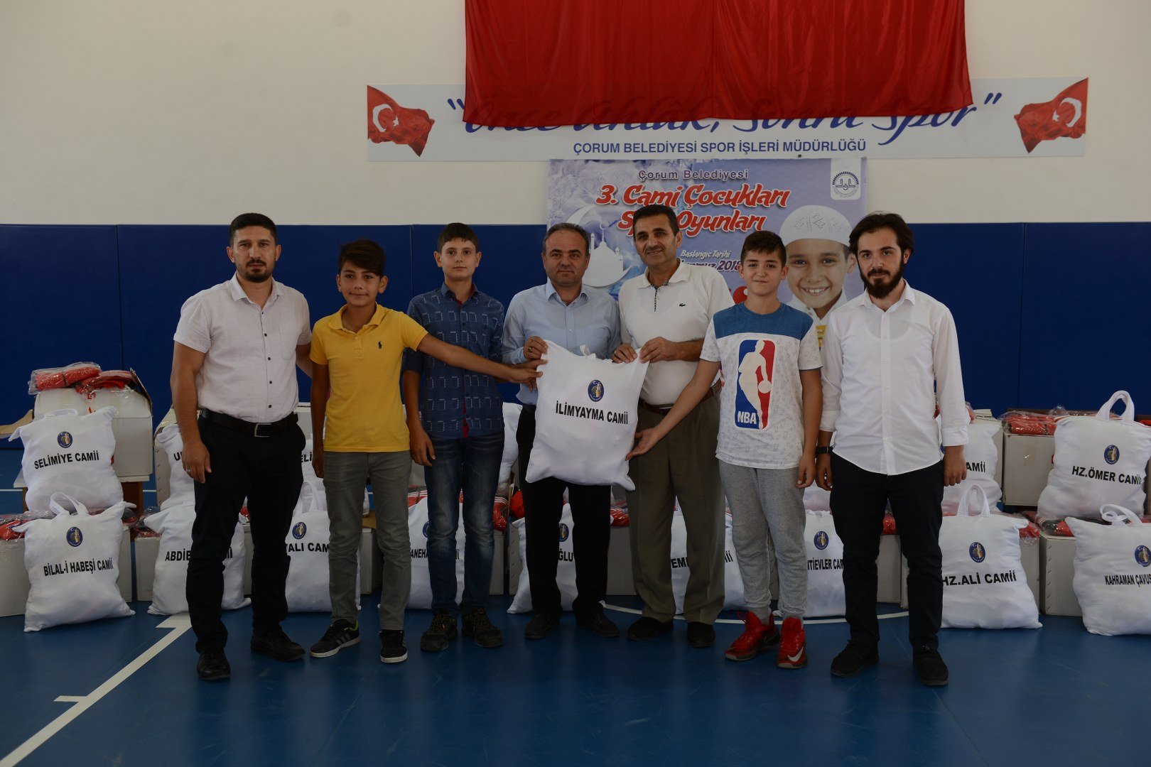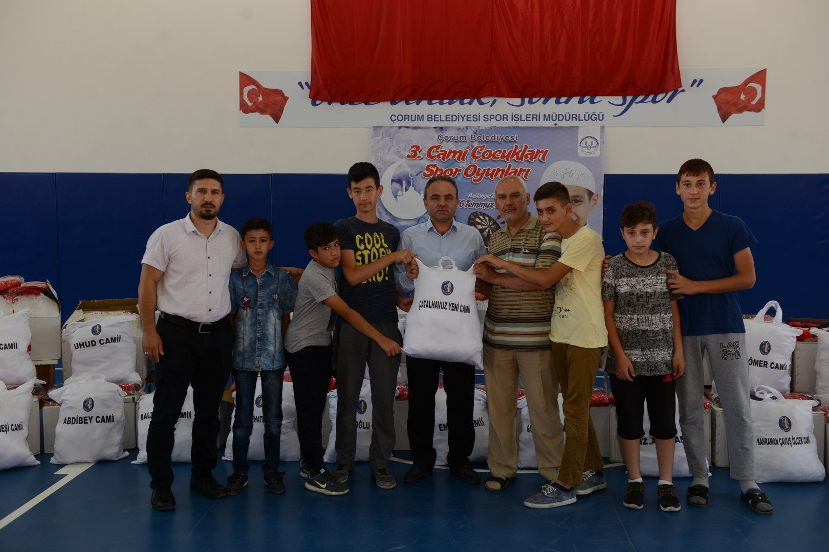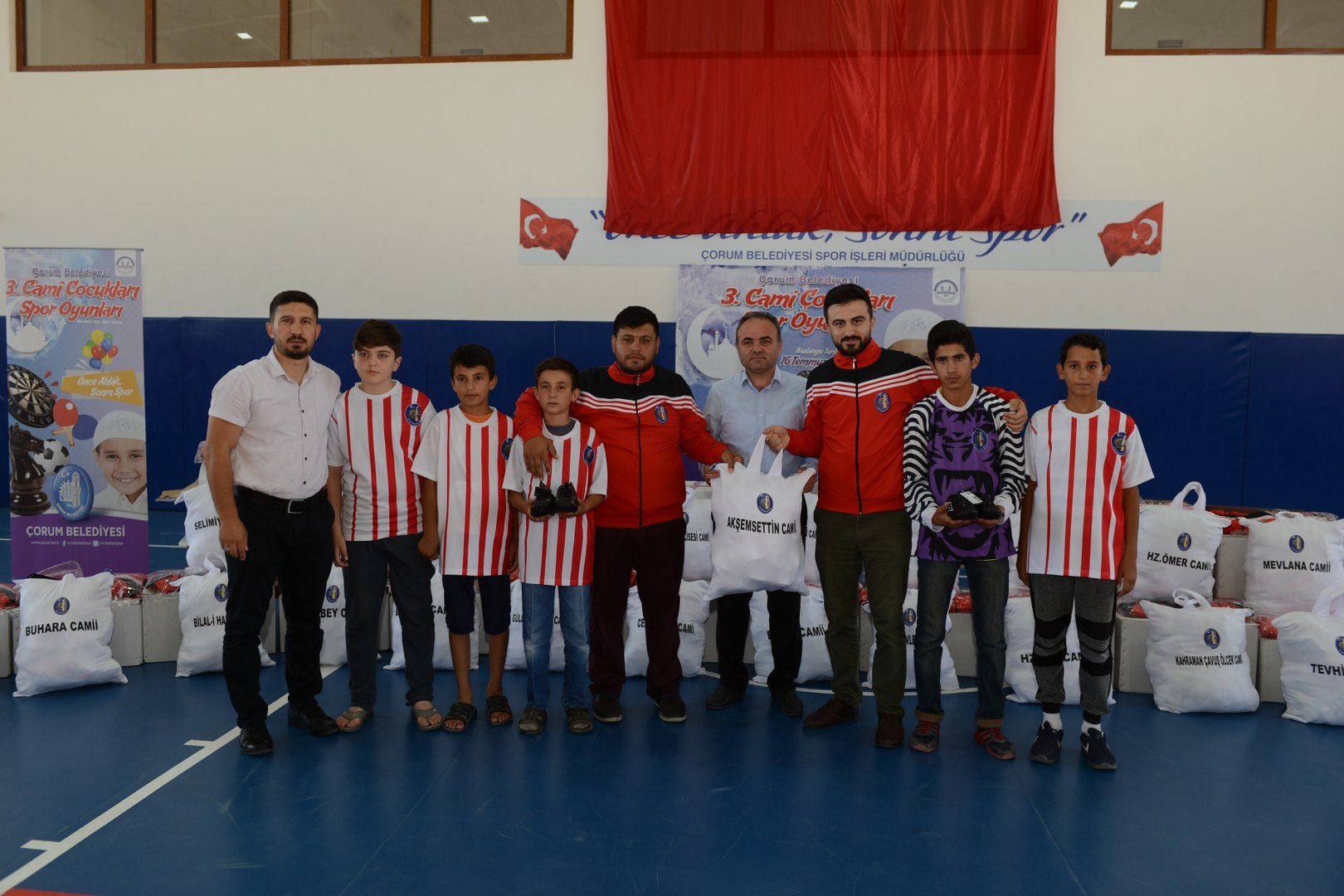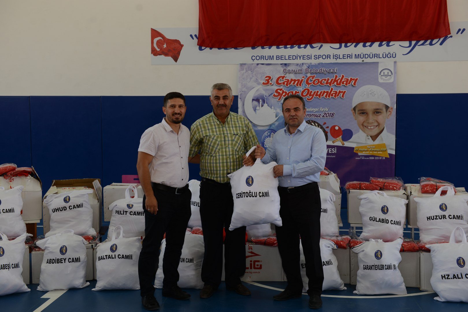 Çorum Belediyesi tarafından bu yıl 3.sü düzenlenen Cami Çocukları Spor Oyunları Futbol Turnuvasına katılan takımlara malzemeleri dağıtıldı.