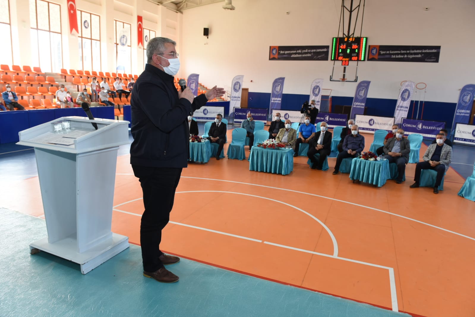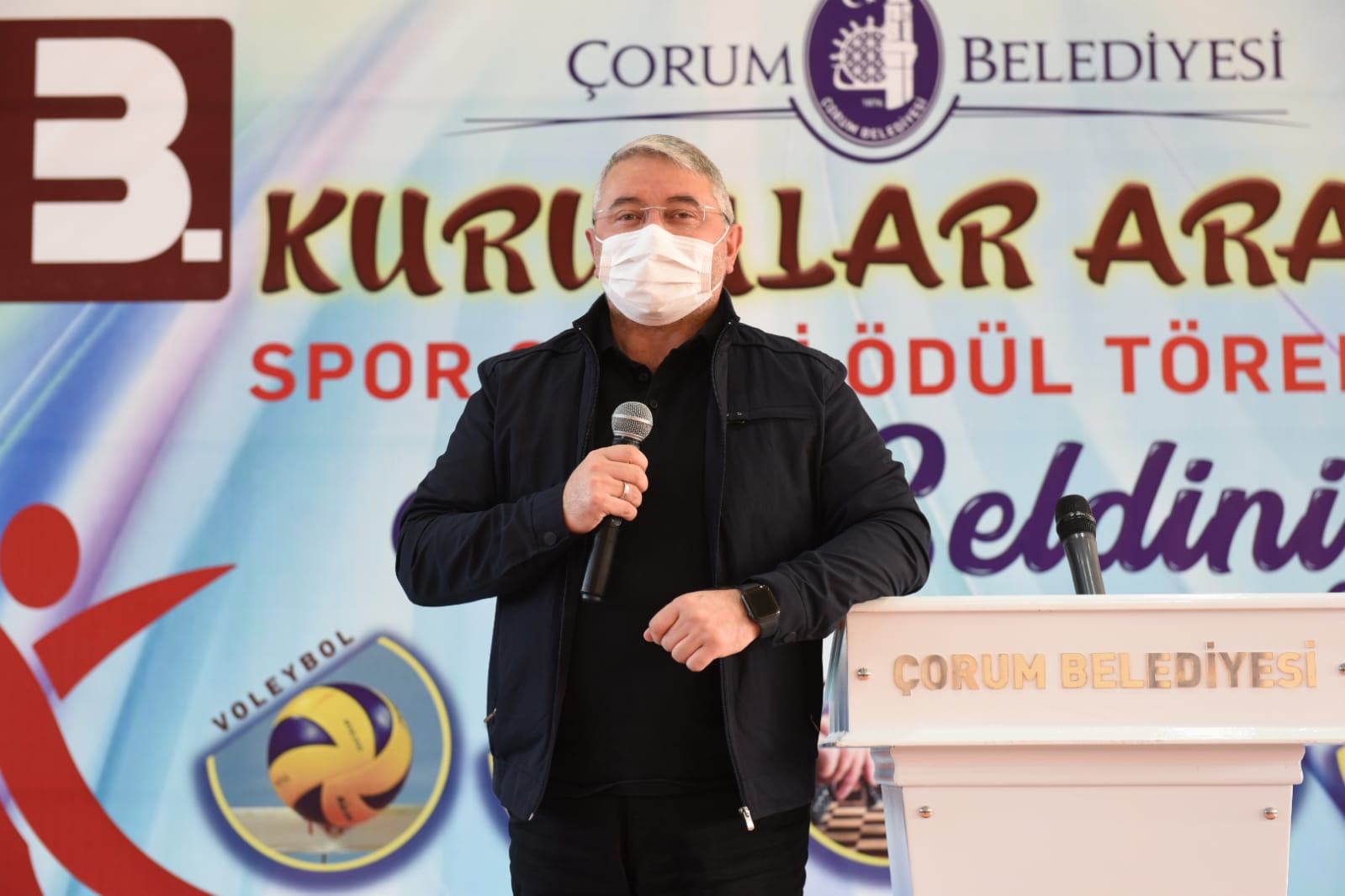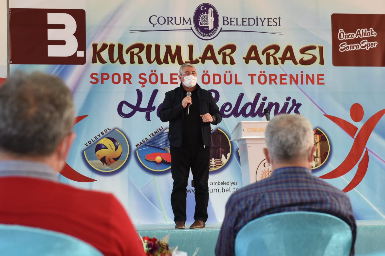 Belediye Başkanımız Dr. Halil İbrahim Aşgın ödül töreninde yaptığı konuşmada,”açtığımız önemli salonlardan biri de Şehit Abdullah Tayyip Olçok adını verdiğimiz şuanki töreni düzenlediğimiz salonumuz. Mevlana İş Merkezi’nde salonlarımız var. Gülabibey Mahallesi ve Ulakavak Mahallesi’nde yapımına önümüzdeki günlerde başlayacağımız havuzlarımız var. Aslında girmek istediğimiz sadece sokaklar değil, gönüllere de girmek istiyoruz. Ama bizim için sportif anlamda 2021 yılı şehrimiz adına dönüm noktası olacak. Bundan sonra Çorum sporu hakkında 2021’den öncesi, 2021’den sonrası şeklinde dile getirilecek. Geçtiğimiz aylarda Gençlik ve Spor Bakanlığı ile bir protokol imzaladık. Bu anlamda 2 tane butik yüzme havuzunun temelini yakında atacağız. Yine dört tane semt sahasının ihale süreçlerinin tamamlanması ile birlikte temelini atacağız. Yine amatör futbol kulüplerimizin maç yapacağı 2 tane sahanın temelini atacağız. Daha birçok sportif yatırımın temellerini 2021’de atacağız. Yeni yapılan Çorum Şehir Stadı Belediyemizin yapmış olduğu güzel hizmetlerden bir tanesi. Belediye olarak biz yaptık. Daha sonra bakanlığa devrini gerçekleştirdik. Yine kapalı spor salonumuzu yüzde 50 oranında tamamladık. Kalan kısmını da inşallah ihale sonrası bakanlığımız tamamlayacak. Dolayısı 2021 yılı, tesisleşme konusunda, sportif faaliyetler konusunda Çorum açısından çok önemli bir yol ayrımı. Hep birlikte inşallah daha üst bir levele, çıtaya yükseleceğiz” diye konuştu.