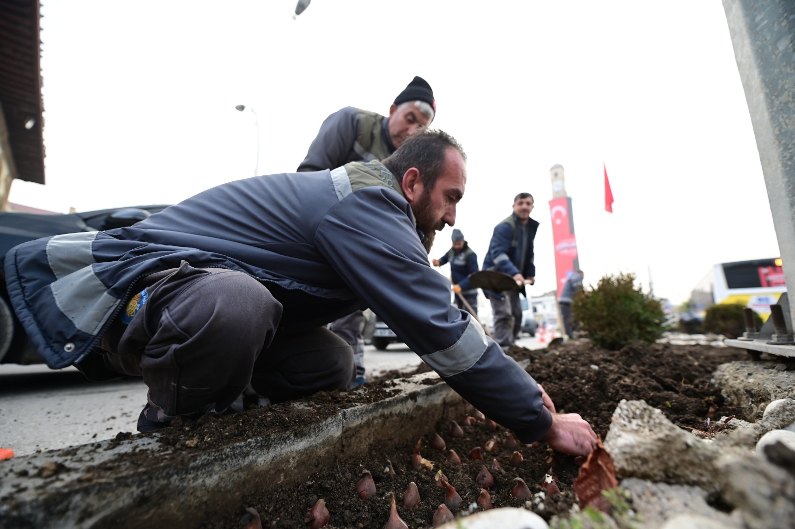 Çorum Belediyesi, baharı rengârenk çiçeklerle karşılamak için şimdiden 320 bin lale, sümbül ve menekşeyi toprakla buluşturuyor.