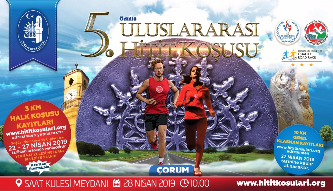 Çorum Belediyesi’nin organize ettiği ve 28 Nisan 2019 Pazar günü düzenlenecek olan 5. Uluslararası Hitit Koşusu’nun kayıtları başladı. Her yıl olduğu gibi bu yıl da 10 km’lik klasman ve 3 km’lik Halk Koşusunda ödüller sahiplerini bulacak.