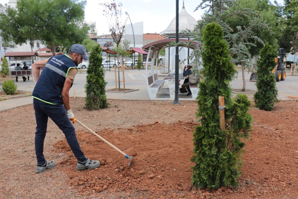 Meydana 17 çınar yapraklı akça ağaç, 12 süs eriği, 7 süs kirazı, 5 süs elması, 9 çam ağacı ve 6 piramit mazı ağacı dikimi yapıldı. Otomatik sulama sistemi kurulumu, çim ekimi ve çevre düzenleme çalışmalarına devam eden ekipler, meydana oturma bankları ve çöp kovalarının montajını da yapıyor.