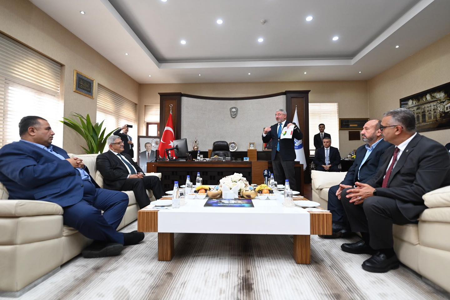 Belediye Başkanı Dr. Halil İbrahim Aşgın, ziyaret sonunda AK Parti Genel Başkan Yardımcısı Demiröz’e günün anısına hediye takdim etti.