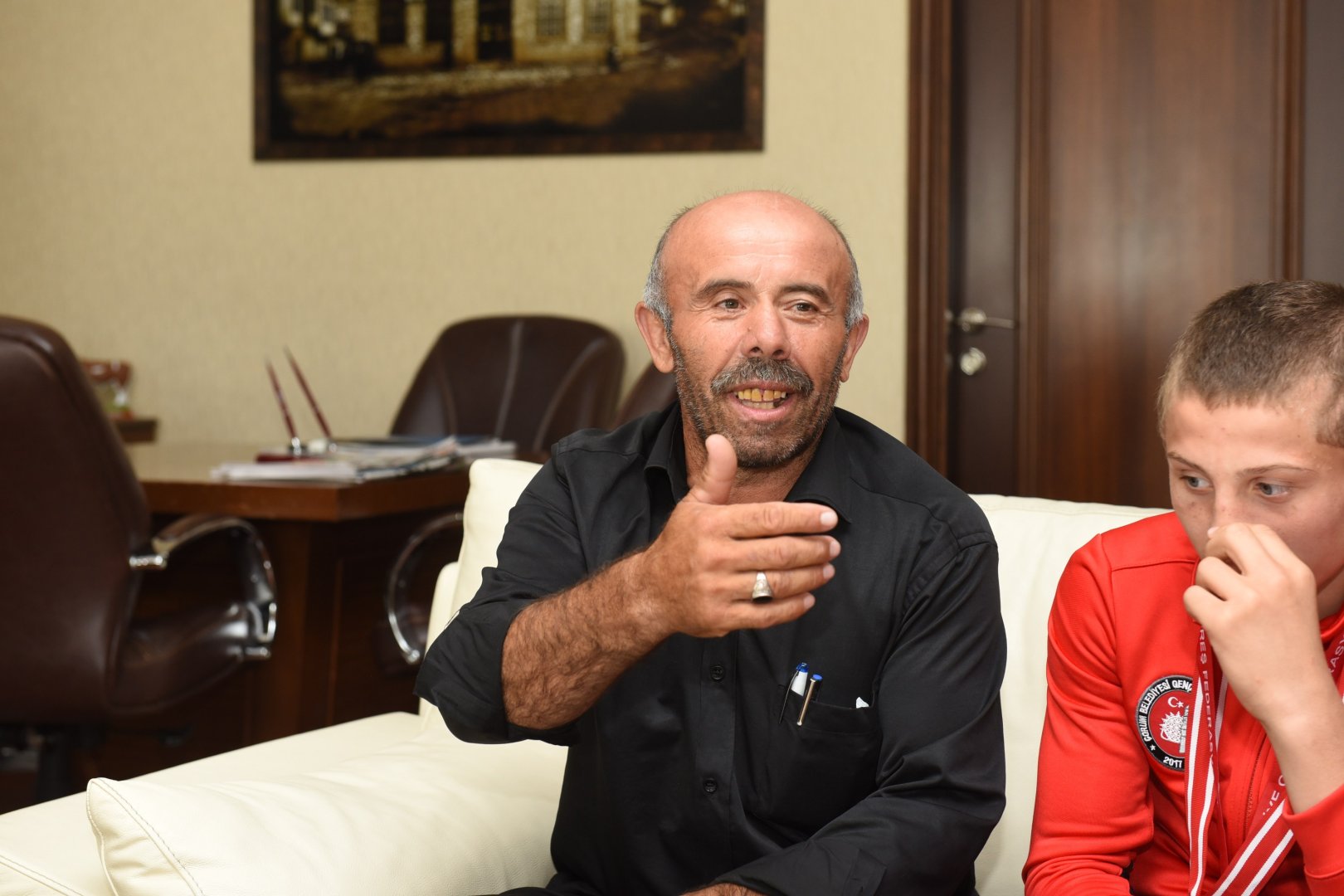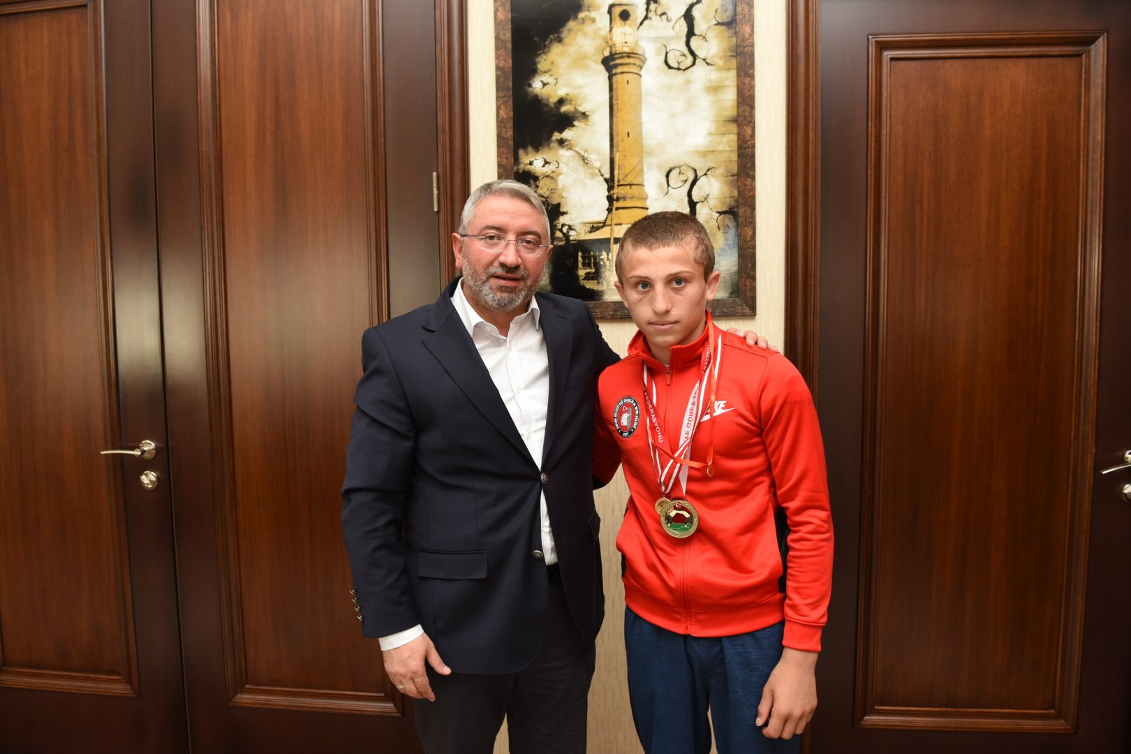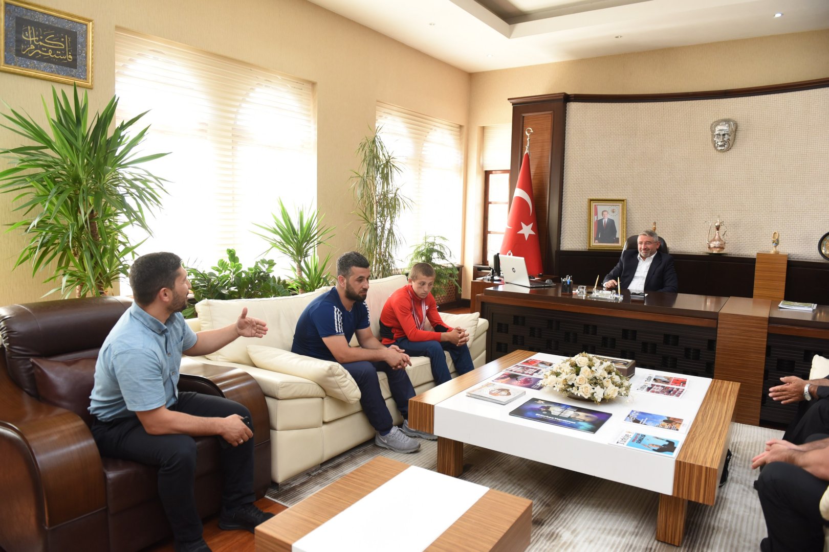 170 sporcunun mücadele ettiği Teşvik 1 Boyda rakiplerini bir bir yenerek şampiyonluğa ulaşan Ferhat Yiğit, Çorum Belediyesi Gençlik ve Spor Kulübü Başkanı Nadir Solak, antrenörler Adem Uysal, Levent Kaleli ve babası Mehmet Yiğit ile birlikte Belediye Başkanımız Dr. Halil İbrahim Aşgın’ı makamında ziyaret etti. Ziyarette kısa bir konuşma yapan sporcunun babası Mehmet Yiğit kendilerine destek veren herkese teşekkür ederken, oğlu ile gurur duyduklarını ifade etti. Sporcunun antrenörü Adem Uysal ise Fatih’in çok azimli ve çalışkan olduğunu yaklaşık 3 sene evvel güreşe başlamasına rağmen 3 Türkiye Şampiyonluğu bulunduğunu şimdi ise Kırkpınar şampiyonlu elde ettiğini dile getirerek başta Belediye Başkanımız Dr.Halil İbrahim Aşgın olmak üzere kendilerine destek veren herkese teşekkür etti.