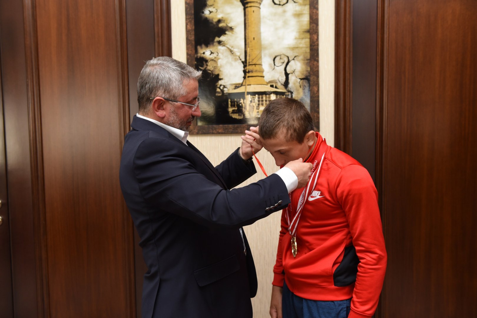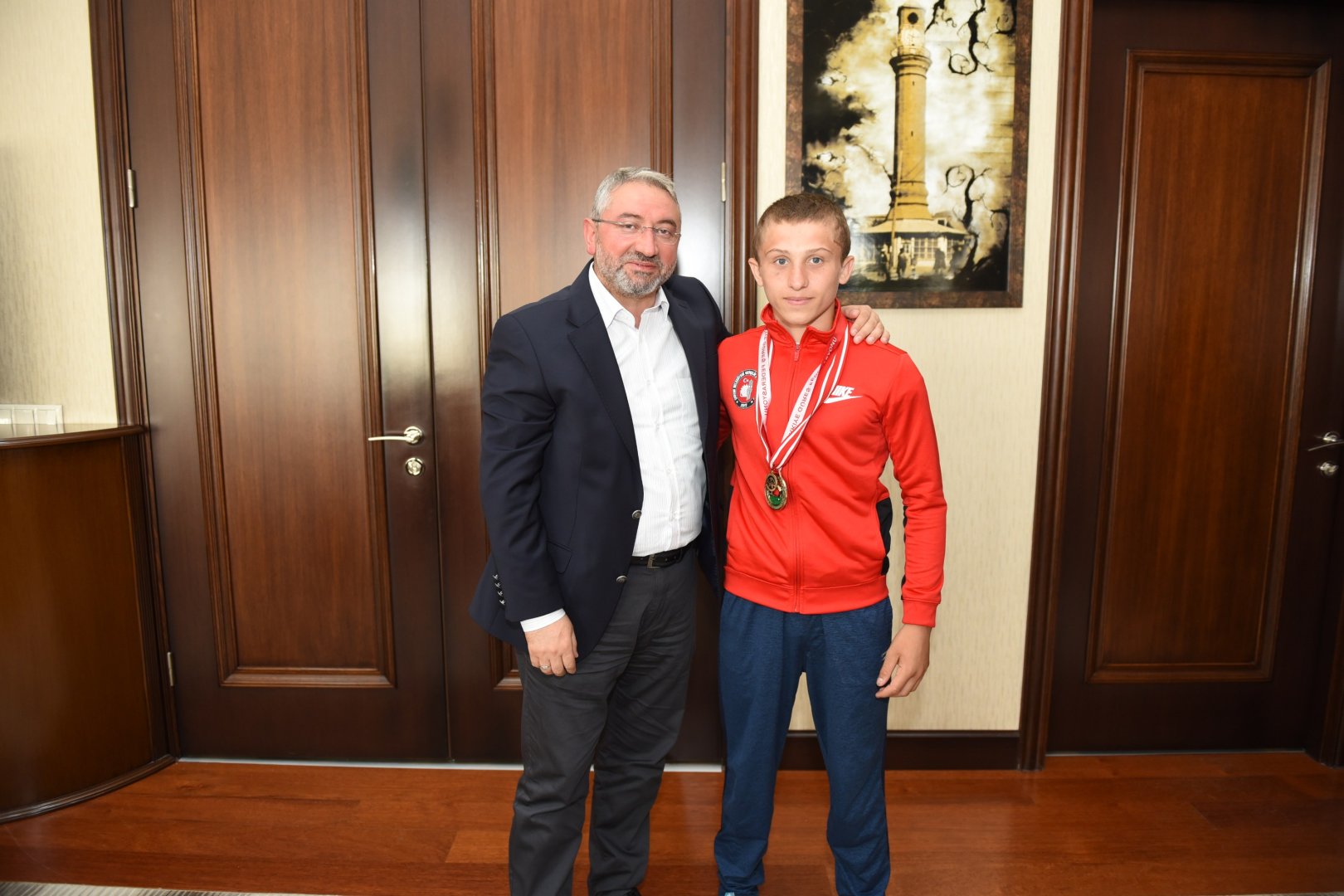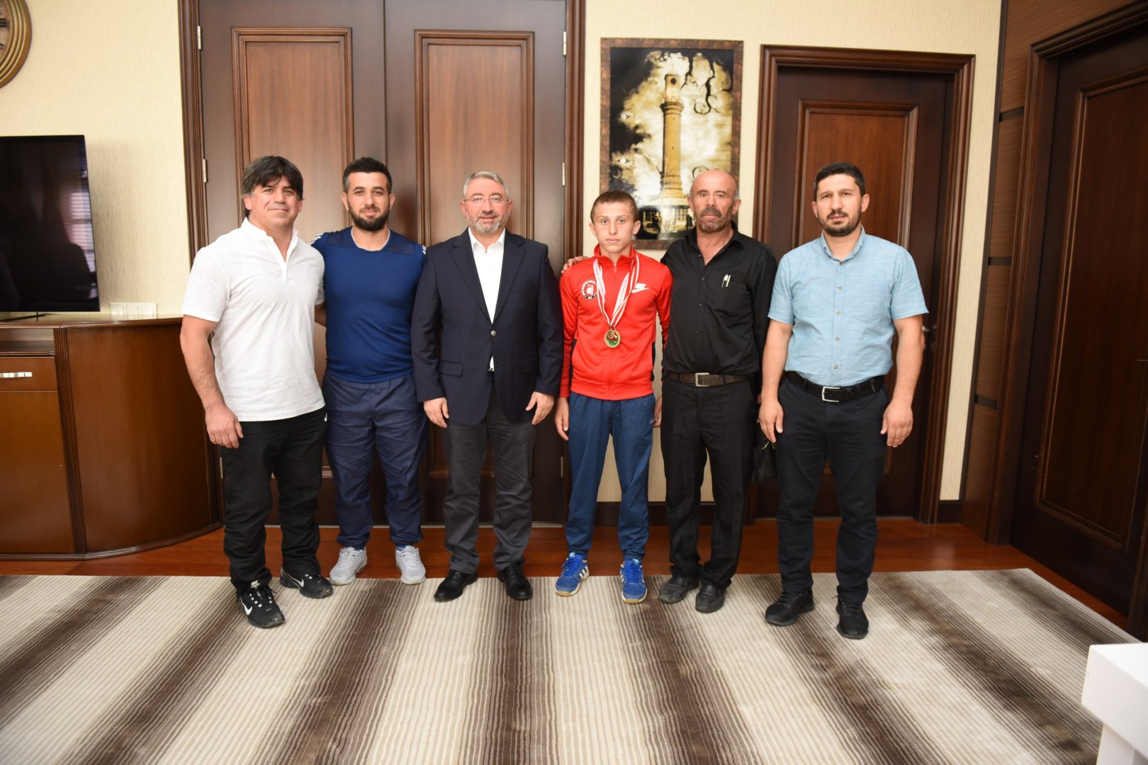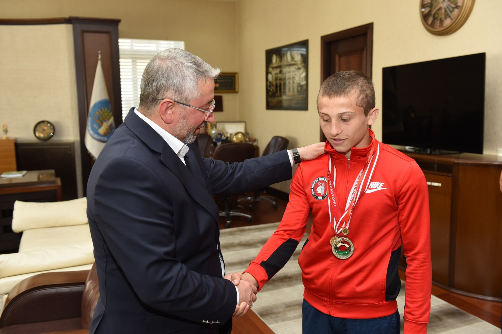 170 sporcunun mücadele ettiği Teşvik 1 Boyda rakiplerini bir bir yenerek şampiyonluğa ulaşan Ferhat Yiğit, Çorum Belediyesi Gençlik ve Spor Kulübü Başkanı Nadir Solak, antrenörler Adem Uysal, Levent Kaleli ve babası Mehmet Yiğit ile birlikte Belediye Başkanımız Dr. Halil İbrahim Aşgın’ı makamında ziyaret etti. Ziyarette kısa bir konuşma yapan sporcunun babası Mehmet Yiğit kendilerine destek veren herkese teşekkür ederken, oğlu ile gurur duyduklarını ifade etti. Sporcunun antrenörü Adem Uysal ise Fatih’in çok azimli ve çalışkan olduğunu yaklaşık 3 sene evvel güreşe başlamasına rağmen 3 Türkiye Şampiyonluğu bulunduğunu şimdi ise Kırkpınar şampiyonlu elde ettiğini dile getirerek başta Belediye Başkanımız Dr.Halil İbrahim Aşgın olmak üzere kendilerine destek veren herkese teşekkür etti.