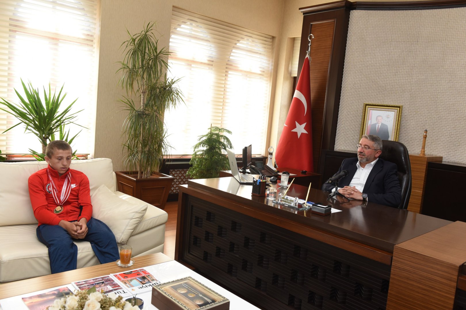 “Şehrimiz açısında çok önemli bir başarıya imza atan Ferhat Yiğit’in elde ettiği başarıyla onur duyduk, mutlu olduk” diyen Belediye Başkanımız Dr. Halil İbrahim Aşgın, “Ferhat, Çorum Belediyesi Gençlik ve Spor Kulübümüzün lisanslı sporcusu. Elde edilen başarıdan dolayı spor müdürümüz Nadir Solak’a ve güreşin genel koordinatörü Levent Kaleliye de teşekkür ediyorum. Bu başarı azımsanacak bir başarı değil. Kardeşimiz 3 sene evvel spora başlamasına rağmen muazzam bir seviyeye geldi. 658. Kırkpınar Yağlı Güreşlerinde ilimizi temsil etti ve 170 sporcuyu geçerek şampiyon oldu. İskilipliler sporcumuzun başarısı ile ne kadar gurur duysa azdır. Çorum’da, İskilip’te yiğidin harman olduğu yerdir. Spor kulübü olarak gerekli desteği hep verdik, bundan sonra da vermeye devam edeceğiz. Önemli olan sportif başarıdır. Sporcumuz ahlakıyla, duruşuyla ne kadar güzel bir eğitim aldığını gösteriyor. Eğitimini veren hocasına da teşekkür ediyorum. Ailesine de ayrıca teşekkür ediyorum. Soyadları gibi Yiğit bir adam yetiştirmişler. Sporcumuzdan çok büyük başarılar bekliyoruz. Çorum güreşte zaten olimpiyat düzeyinde büyük başarılara imza atmış bir şehir. Alttan böyle sporcularımızın geliyor olması Çorum’un güreş geleceği adına oldukça ümit verici bir durum. Ben bundan sonraki hem akademik eğitiminde, hem de spor yaşamında başarılar diliyorum. İnşallah bu güzel bir başlangıç olur. Önce kiloları artırmak suretiyle baş pehlivanlık, onun öncesinde minderde Türkiye Şampiyonluğu, Avrupa Şampiyonluğu, Olimpiyat Şampiyonluğu bekliyoruz” ifadelerini kullanarak başarılı güreşçiyi yarım altınla ödüllendirdi.