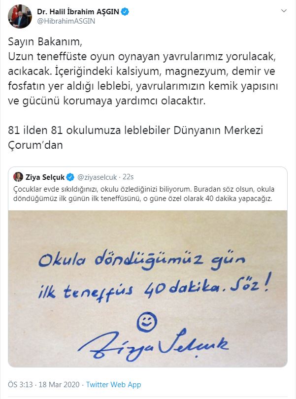 Milli Eğitim Bakanı Prof. Dr. Ziya Selçuk’un sosyal medya hesabından yaptığı paylaşıma yanıt veren Başkan Aşgın, yaptığı bu hareketle büyük beğeni topladı. Bakan Ziya Selçuk, paylaşımında okulların açılmasıyla birlikte ilk teneffüsün 40 dakika olacağını belirtmesi üzerine Başkan Aşgın da sosyal medya hesaplarından Milli Eğitim Bakanı Prof. Dr. Ziya Selçuk’a yanıt olarak “Sayın Bakanım, Uzun teneffüste oyun oynayan yavrularımız yorulacak, acıkacak. İçeriğinde kalsiyum, magnezyum, demir ve fosfat gibi minerallerin yer aldığı leblebi, yavrularımızın kemik yapısını ve gücünü korumaya yardımcı olacaktır. 81 ilden 81 okulumuza leblebiler Dünyanın Merkezi Çorum’dan…” yazdı. Başkan Aşgın’ın bu paylaşımı büyük beğeni topladı.