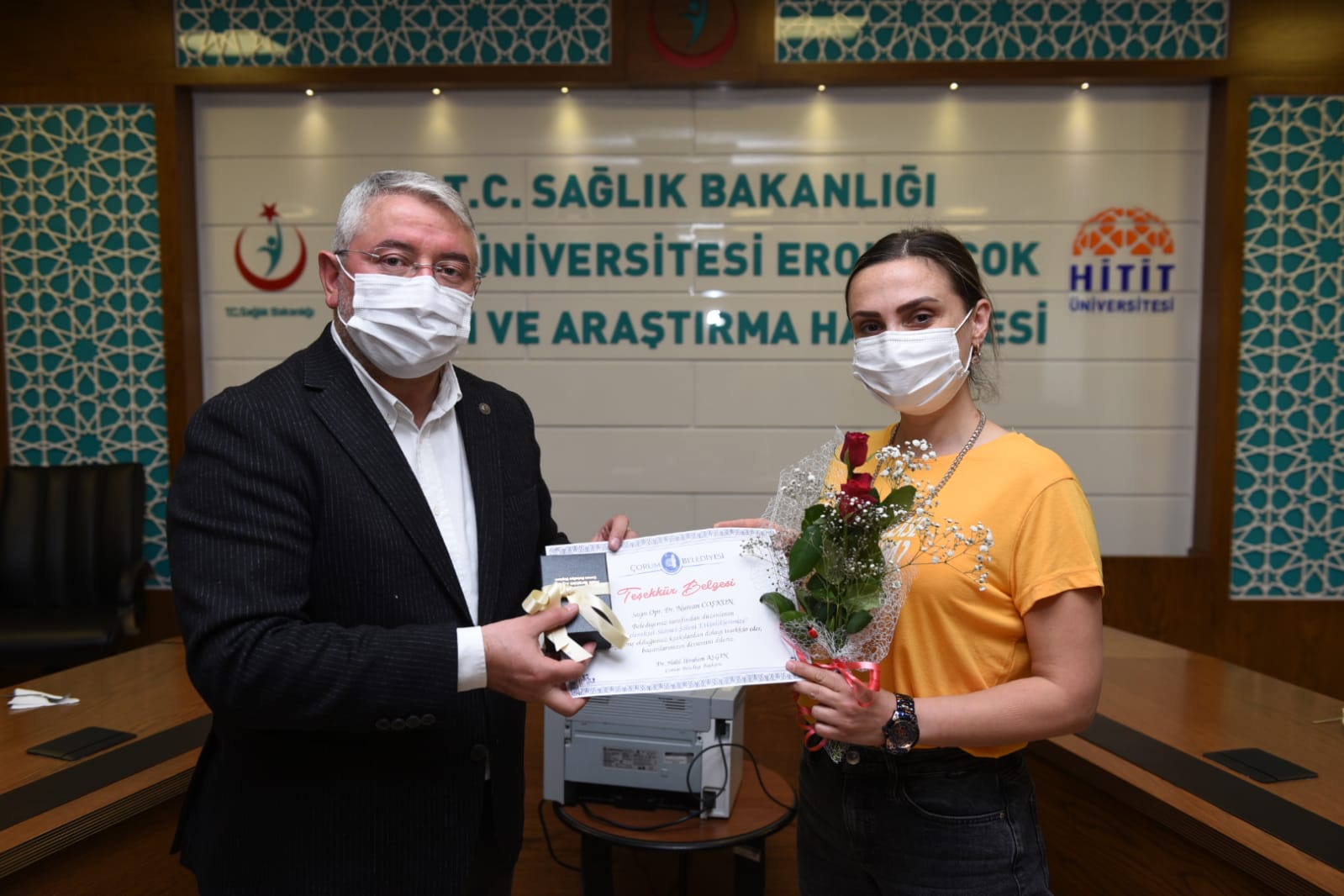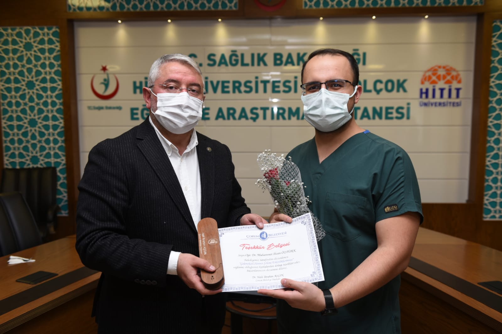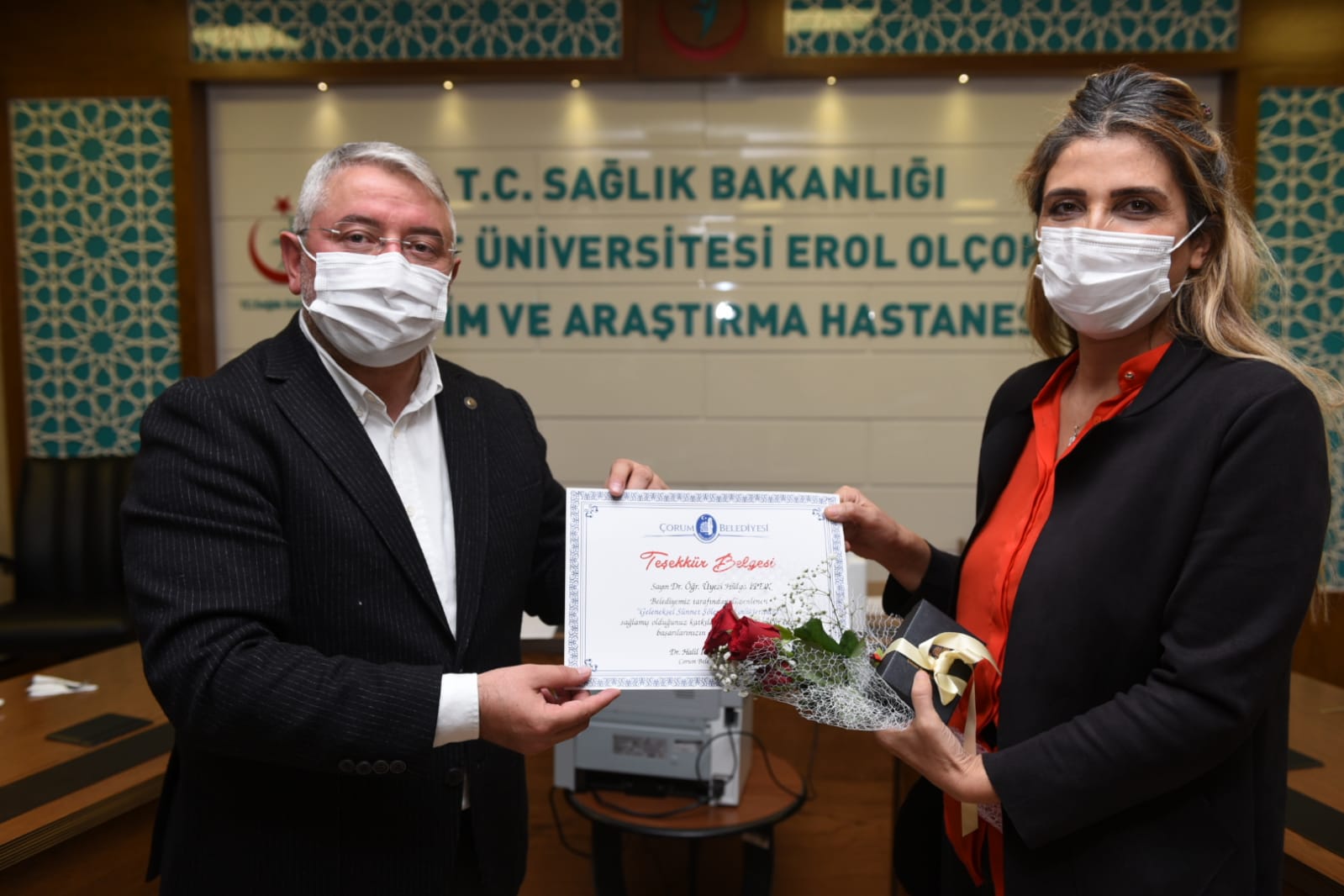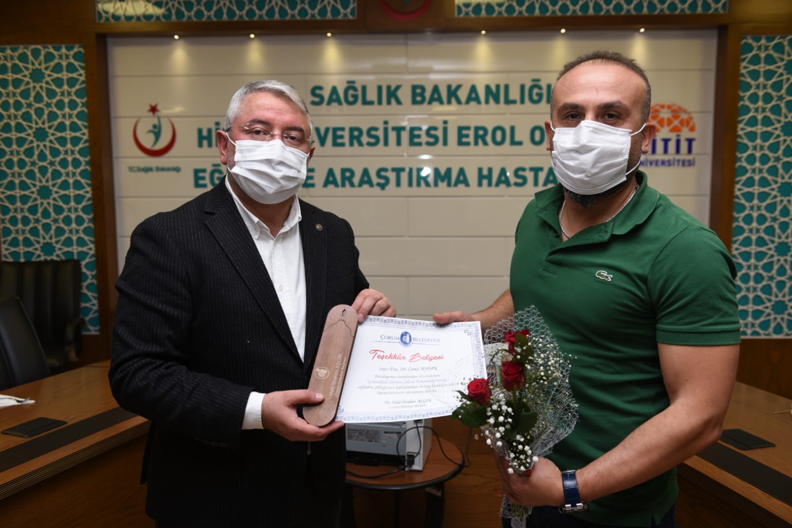 Belediye Başkanımız Dr. Halil İbrahim Aşgın, İl Sağlık Müdürü Uzm Dr. Ömer Sobacı’ya, Hitit Üniversitesi Erol Olçok Eğitim ve Araştırma Hastanesi Başhekimi Prof. Dr. Mesut Sezikli’ye, hastane doktorlarına ve sağlık çalışanlarına başarı belgesi, çiçek ve hediye takdim etti.