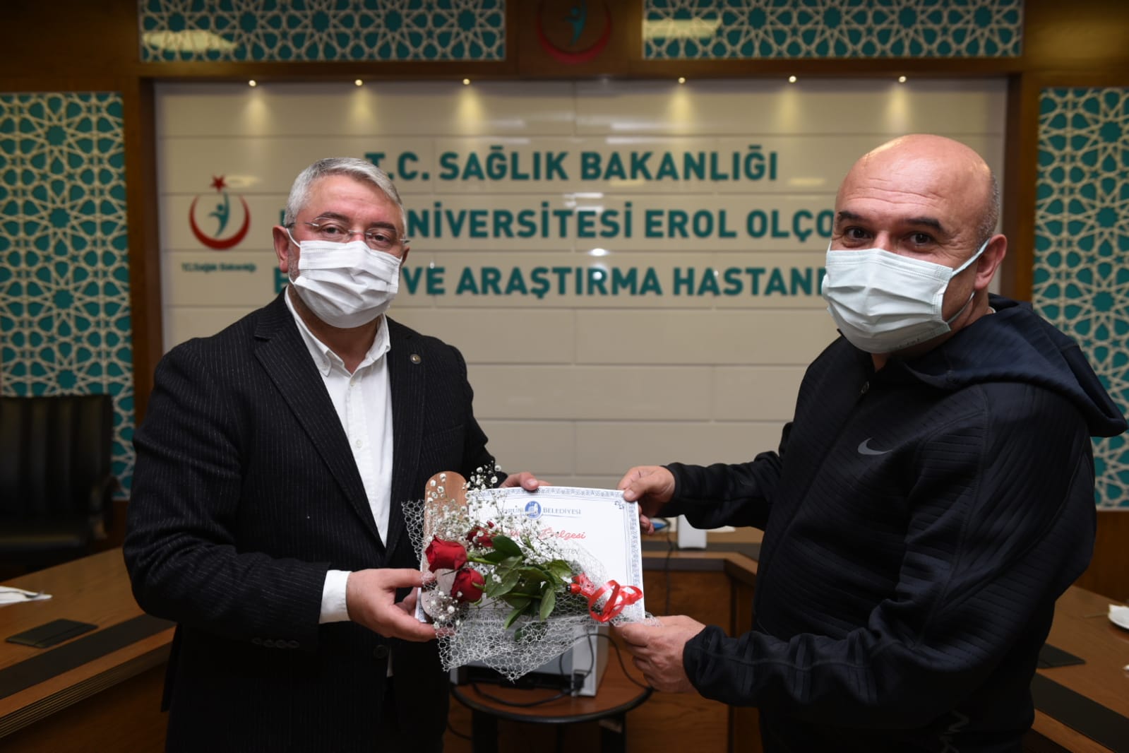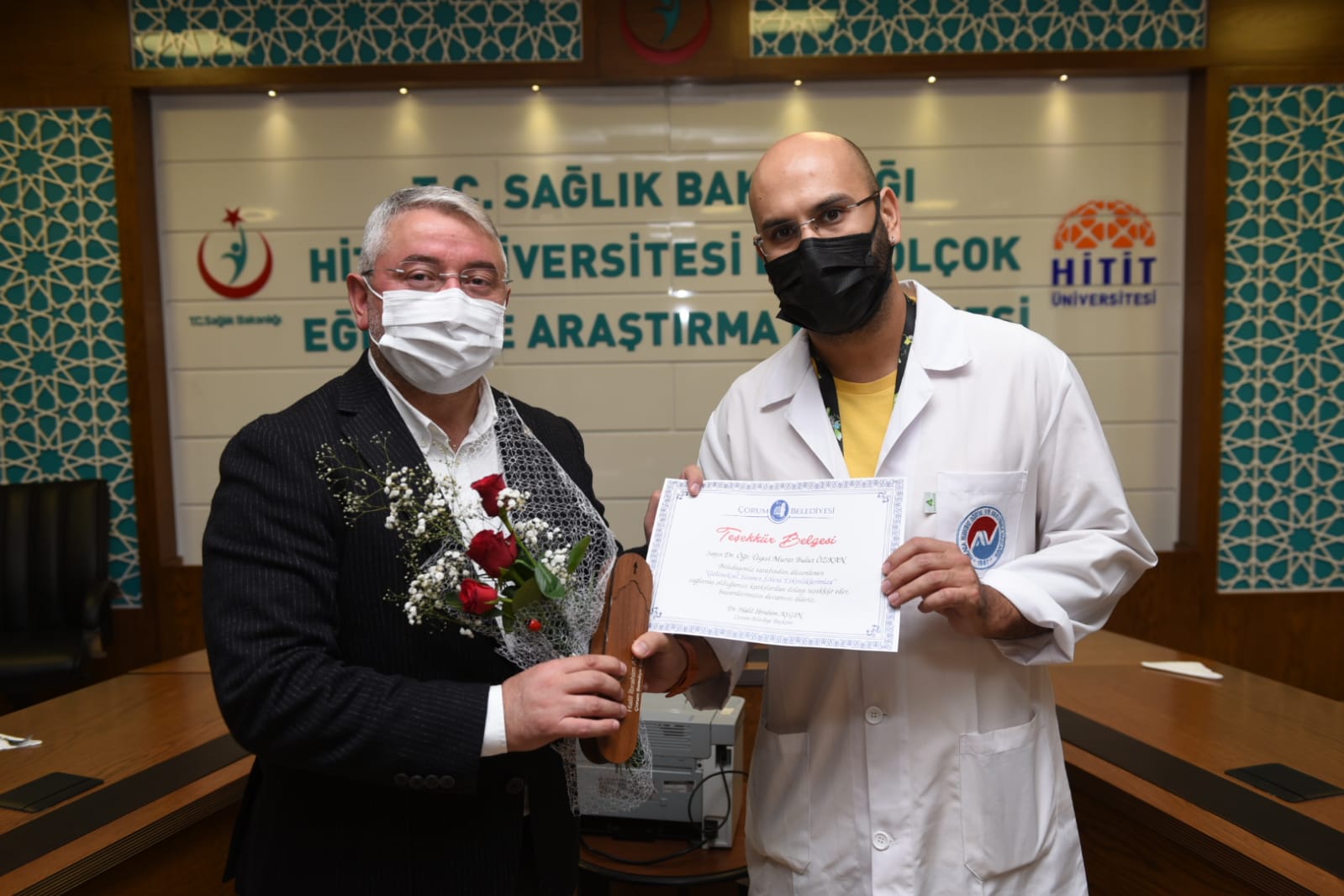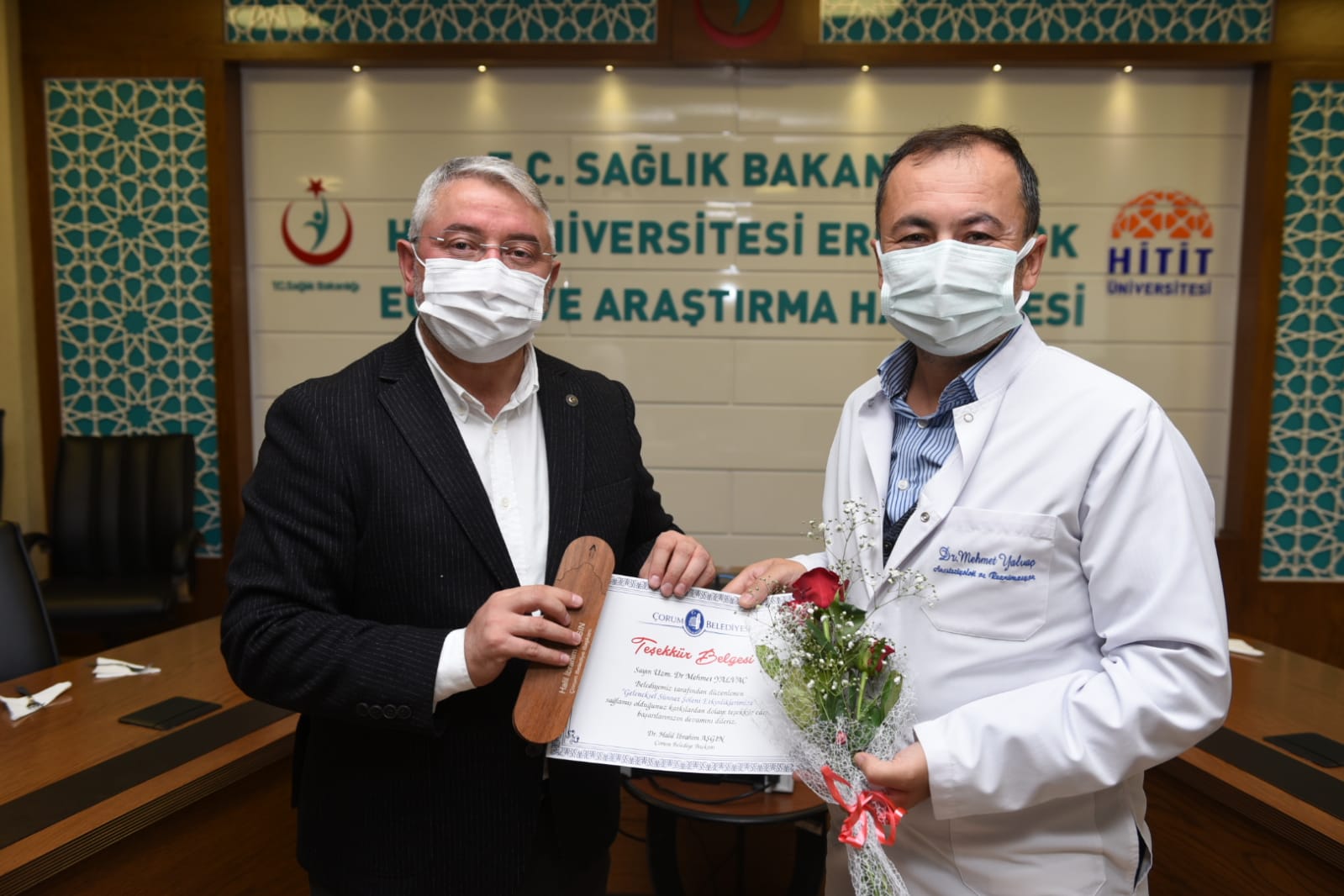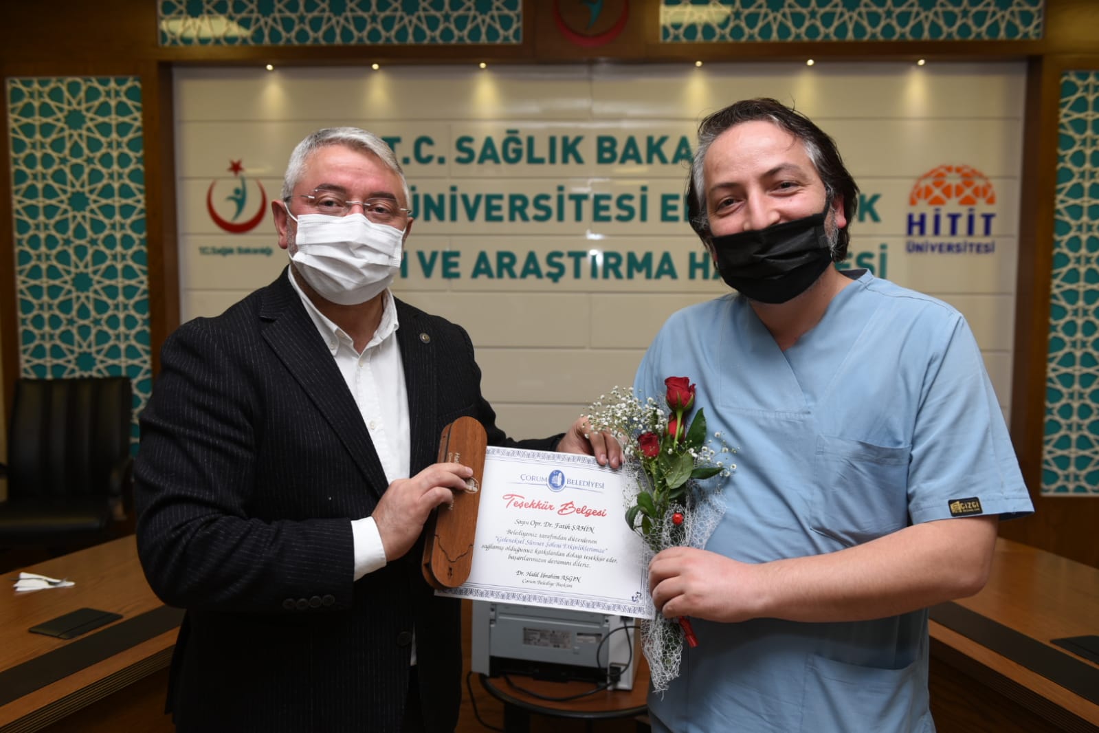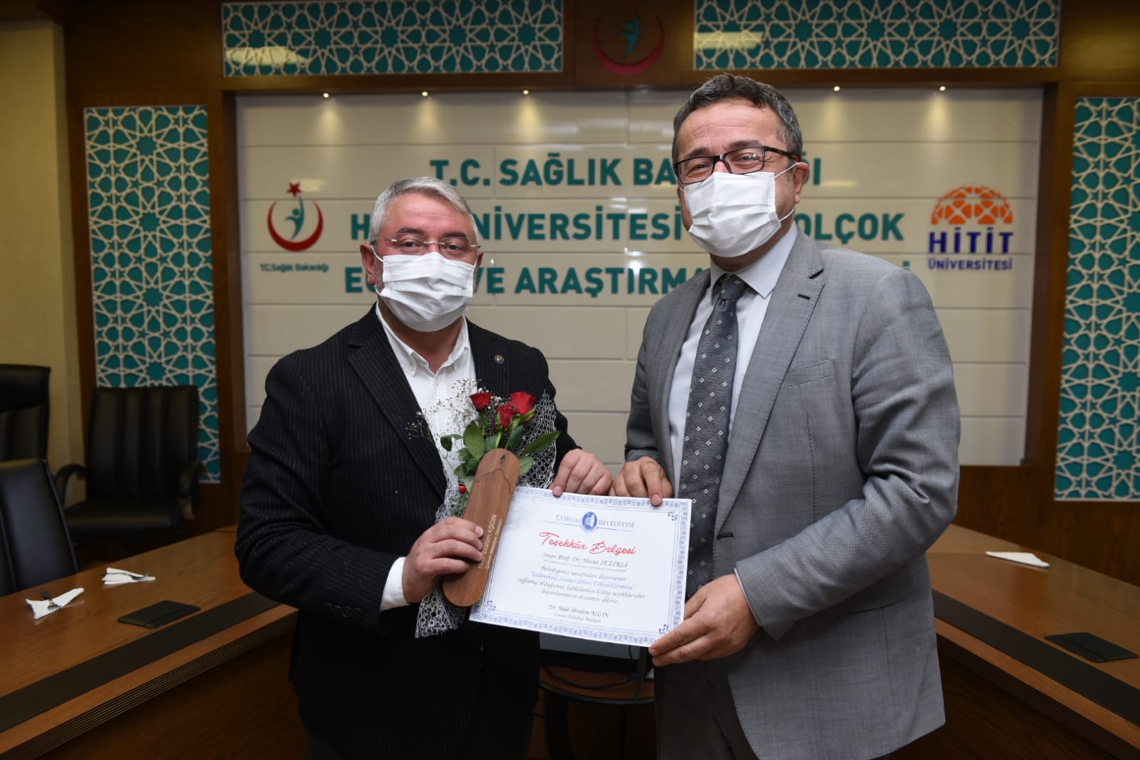 Belediye Başkanımız Dr. Halil İbrahim Aşgın, İl Sağlık Müdürü Uzm Dr. Ömer Sobacı’ya, Hitit Üniversitesi Erol Olçok Eğitim ve Araştırma Hastanesi Başhekimi Prof. Dr. Mesut Sezikli’ye, hastane doktorlarına ve sağlık çalışanlarına başarı belgesi, çiçek ve hediye takdim etti.